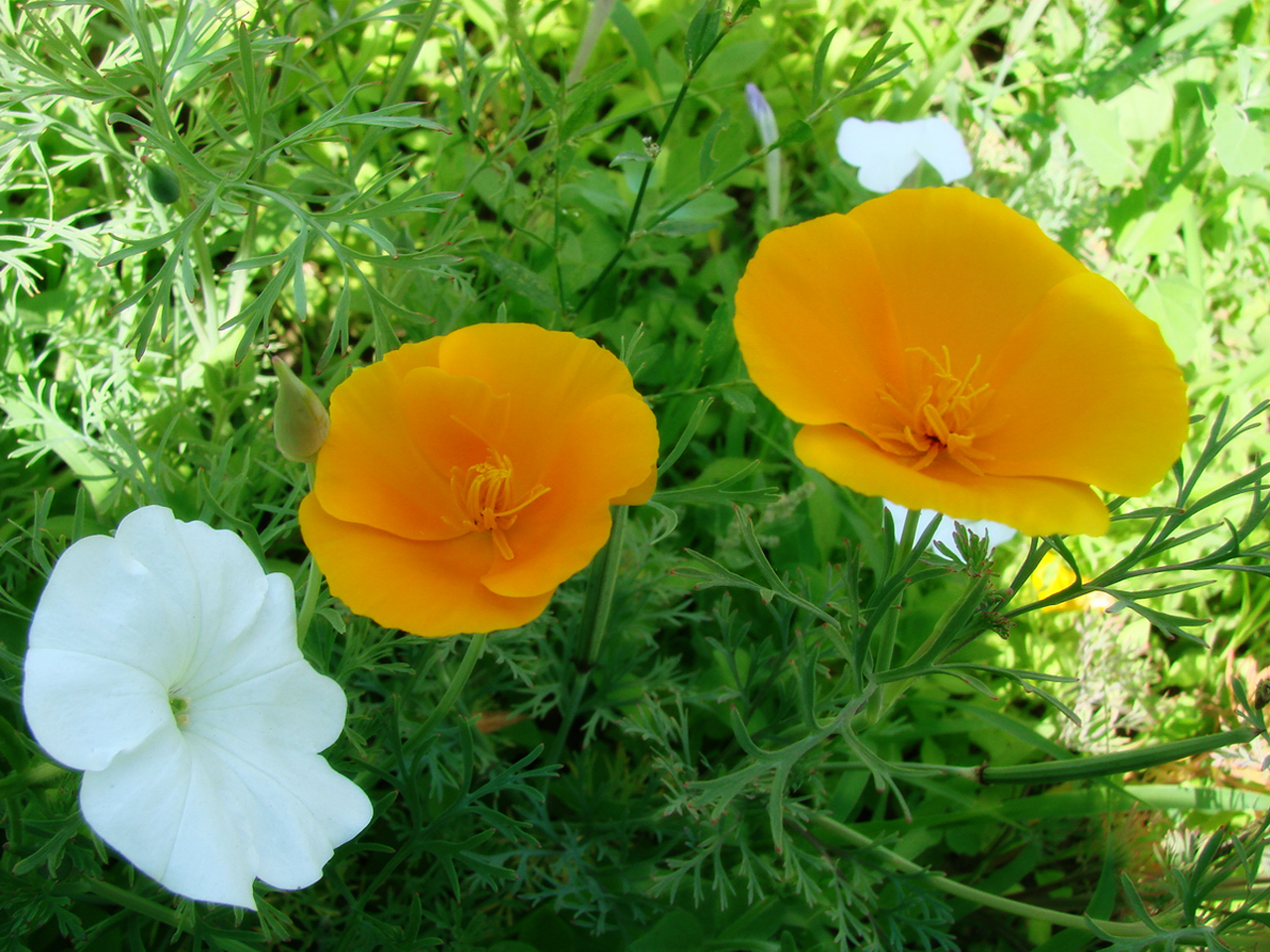 Скачать обои для рабочего стола Два оранжевых цветка и один синий и фото