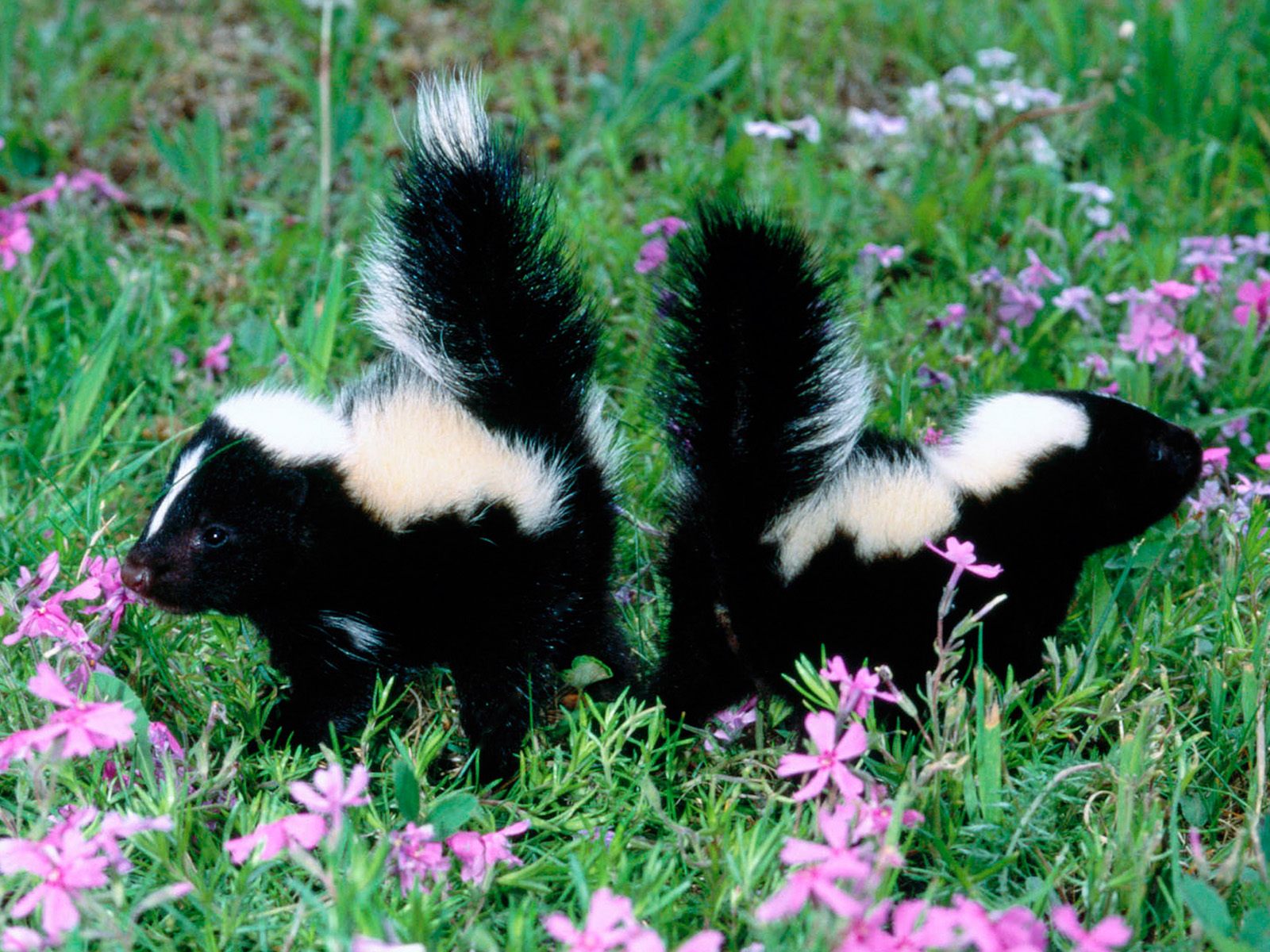 Скачать обои для рабочего стола Два скунса среди цветов и фото