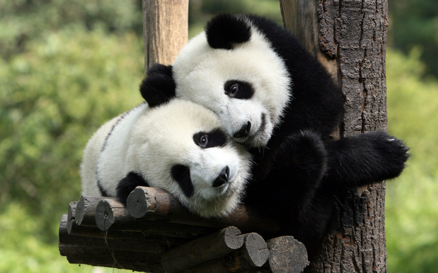 Скачать обои для рабочего стола Две красивых панды на дереве и фото