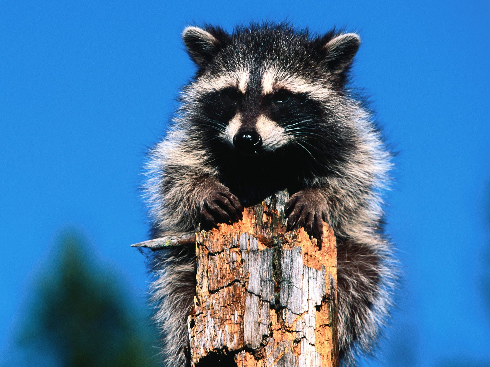 Скачать обои для рабочего стола Енот да стволе дерева и фото