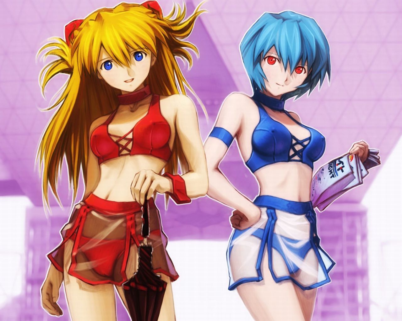 Обои Evangelion - Аска с зонтиком и Рей с листовками
