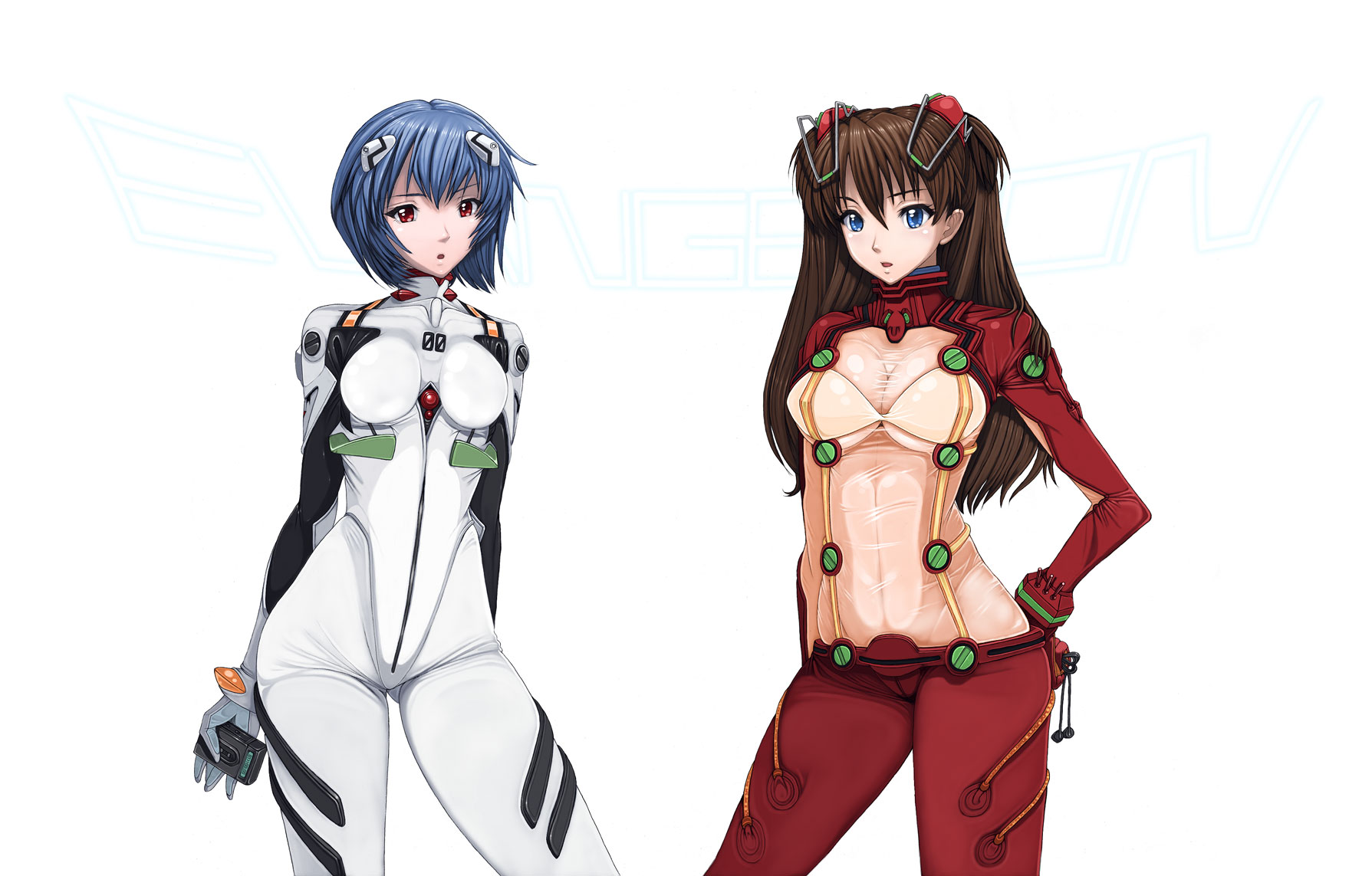Скачать обои для рабочего стола Evangelion - Аянами и Аска в костюмах пилотов на белом фоне и фото