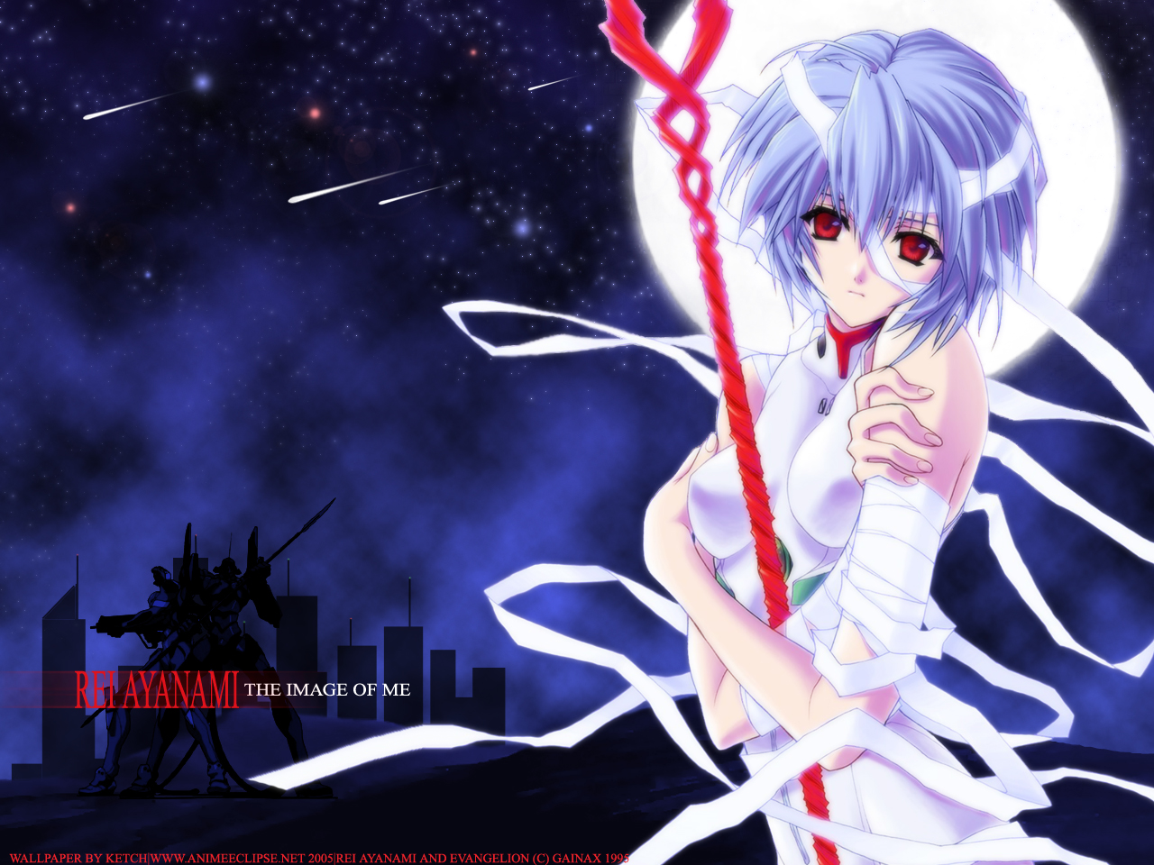 Скачать обои для рабочего стола Evangelion - Rei Ayanami с копьем на фоне луны и фото