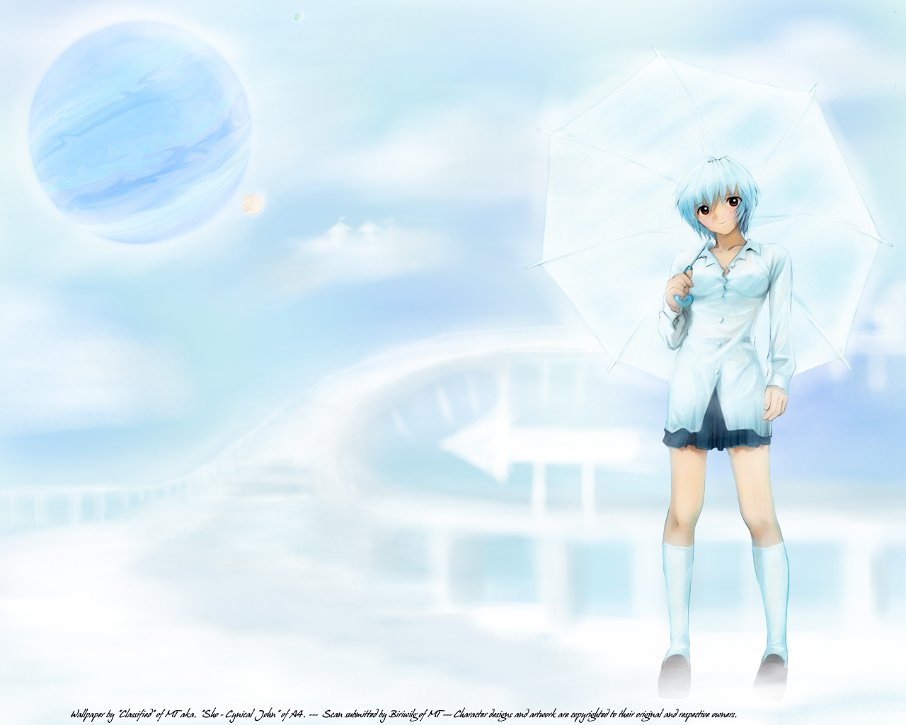 Скачать обои для рабочего стола Evangelion - Рей с зонтиком на дороге и фото