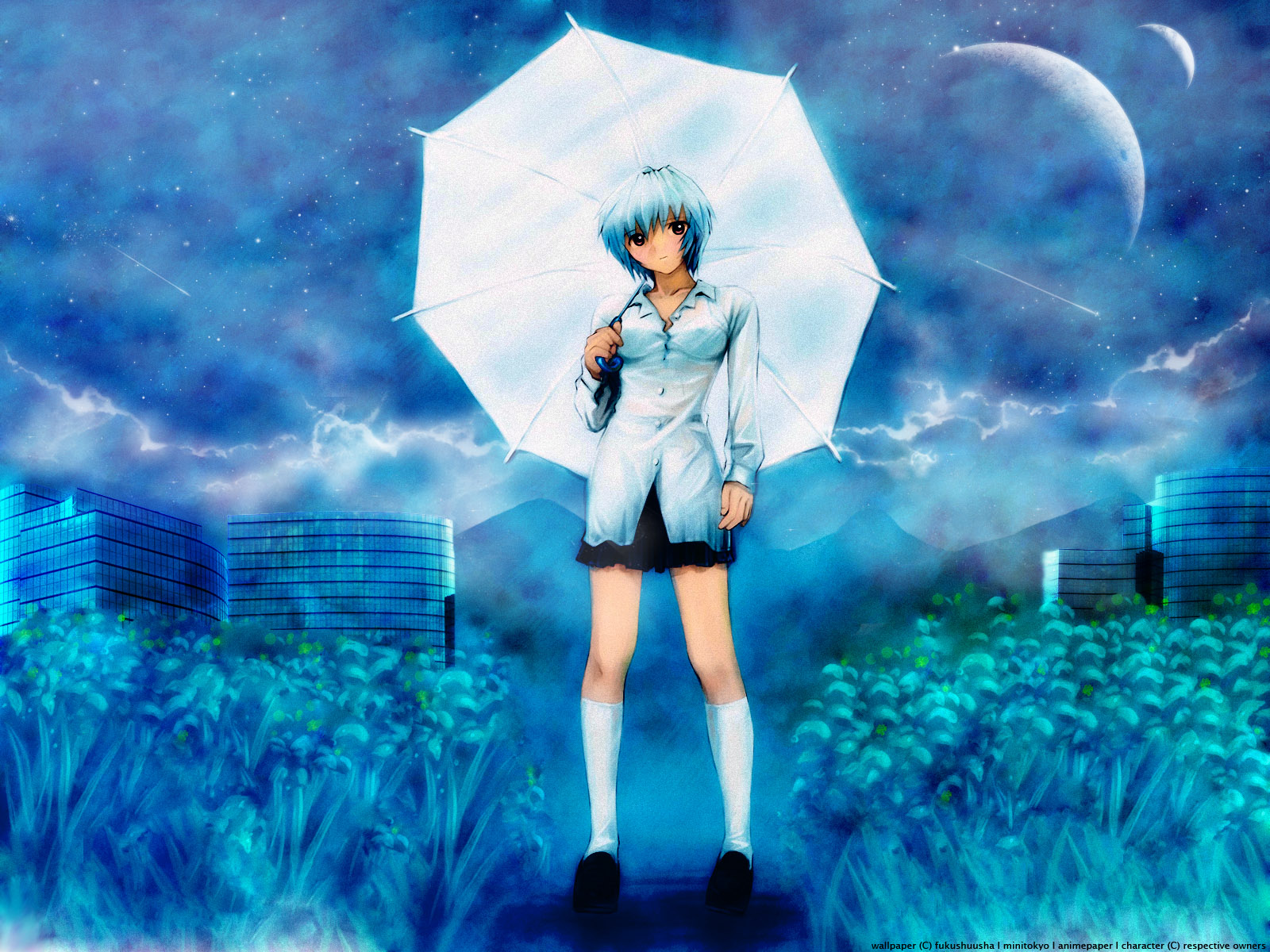 Похожие обои на Evangelion - Рей с зонтиком на фоне города: