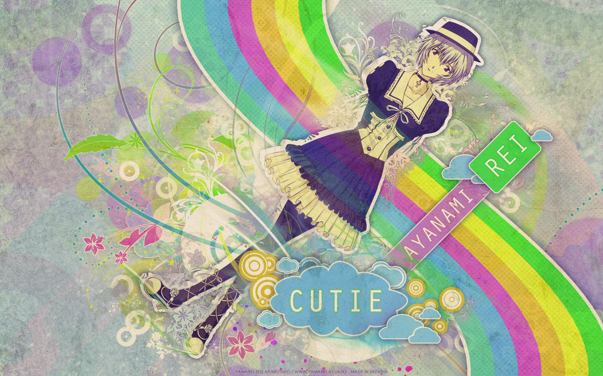 Скачать обои для рабочего стола Evangelion - Рей стоит на фоне радуги и фото