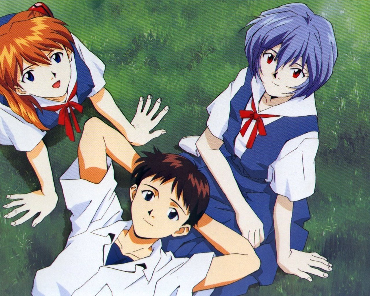 Скачать обои для рабочего стола Evangelion - сидят на травке и фото