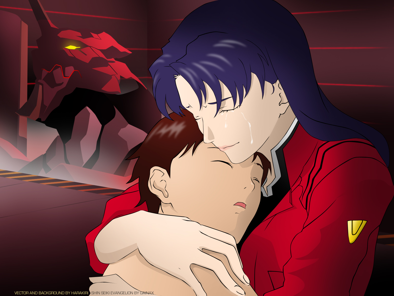 Скачать обои для рабочего стола Evangelion - Синдзи на руках у Мисато и фото