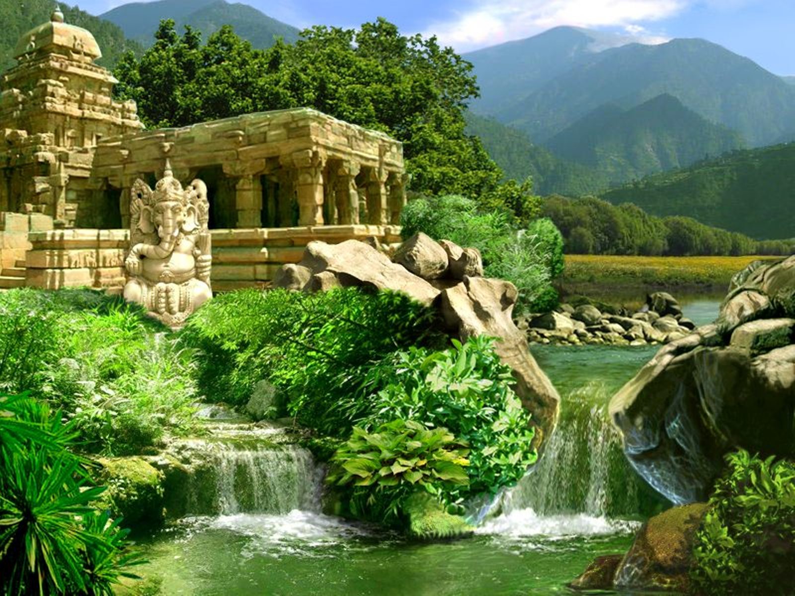 Скачать обои для рабочего стола Ганеша, водопад и горы и фото