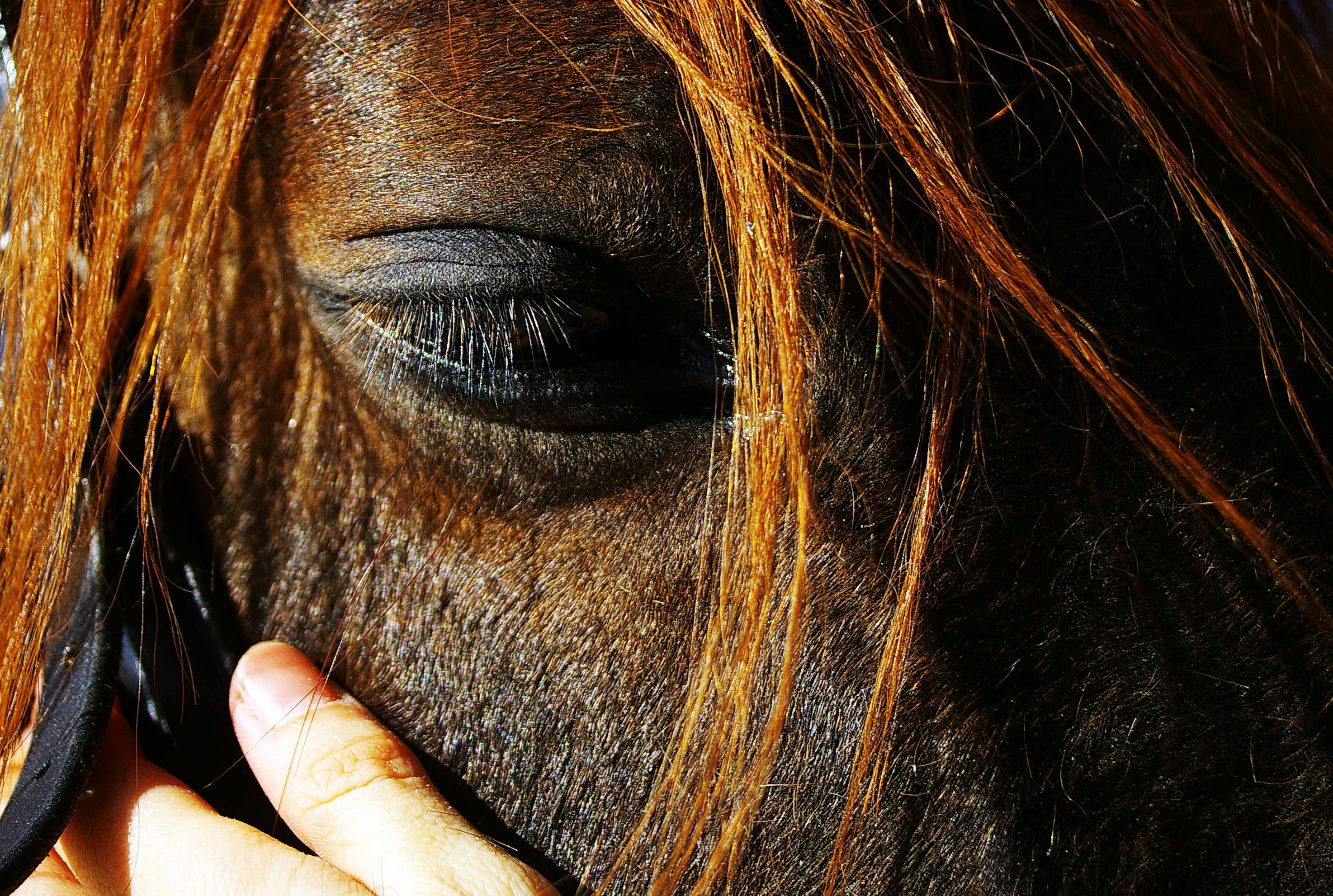 Скачать обои для рабочего стола Глаз гнедой лошади и рука жокей и фото