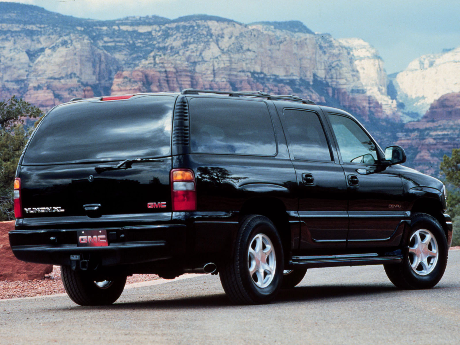 Скачать обои для рабочего стола GMC Yukon на фоне гор вид сзади и фото
