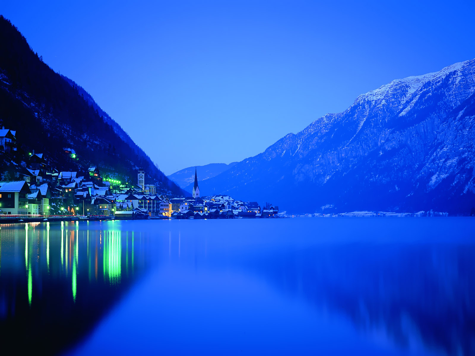 Скачать обои для рабочего стола Голубая лазурь и блики на воде от фонарей и фото