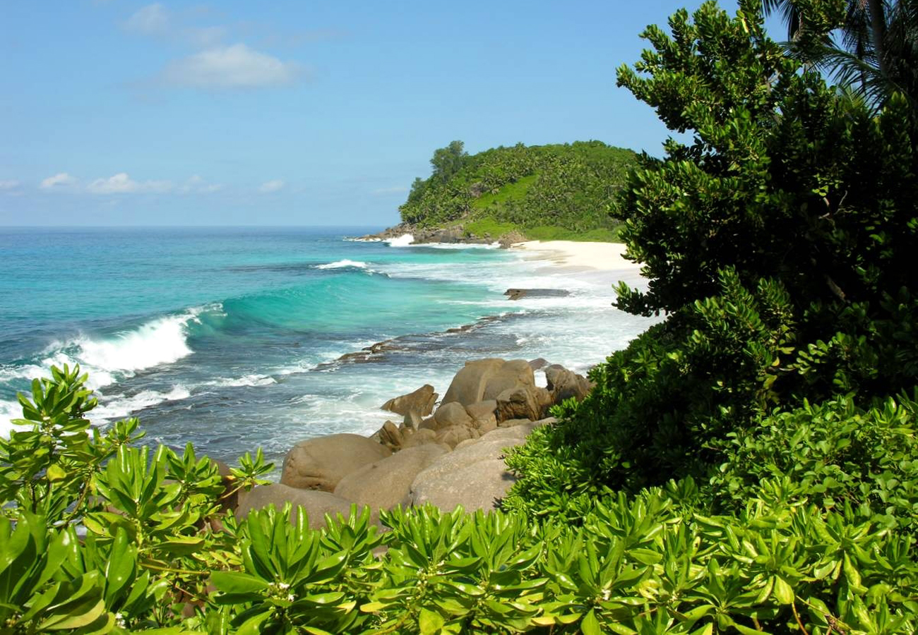 Скачать обои для рабочего стола Голубое море и цветущий берег и фото