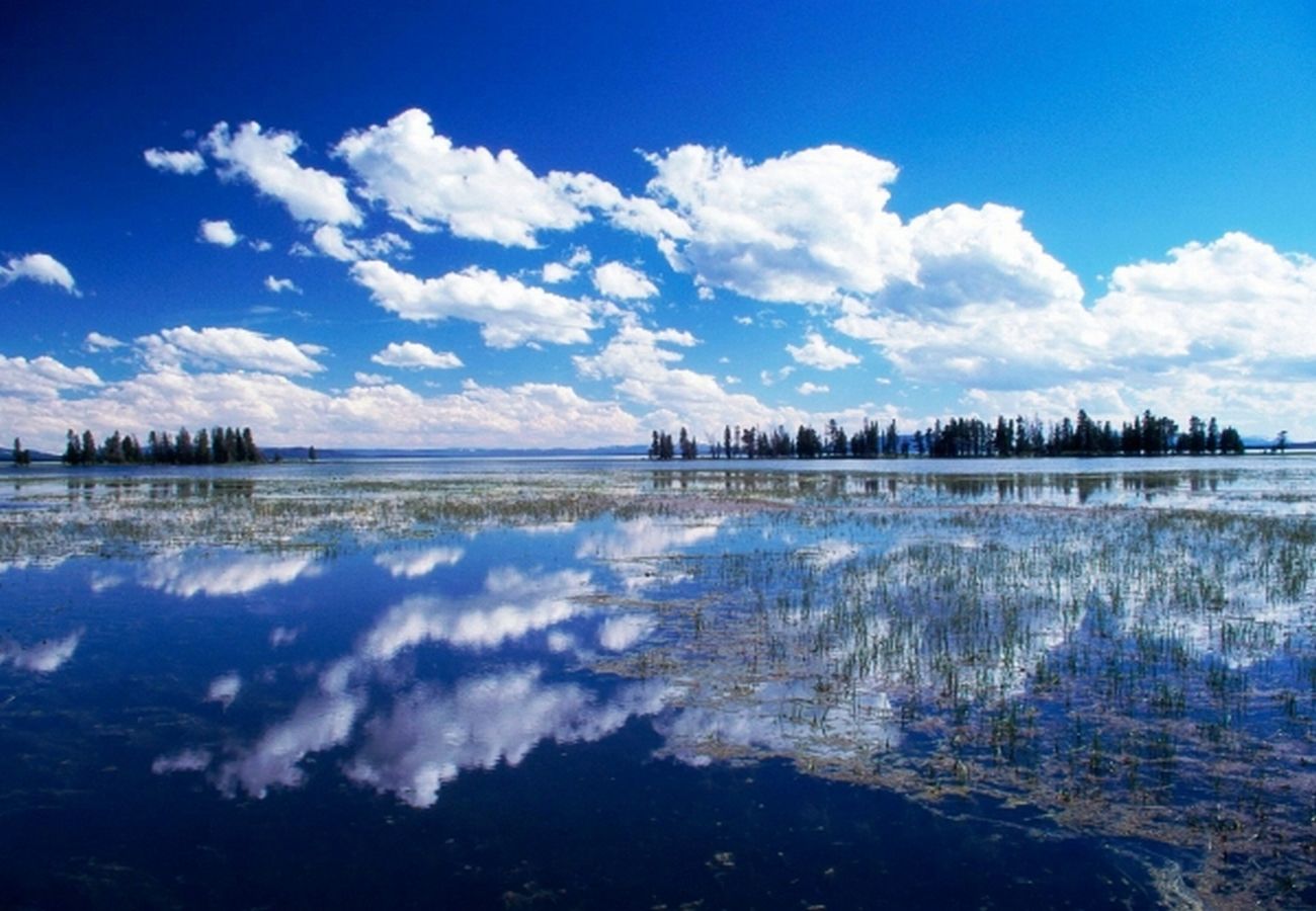 Скачать обои для рабочего стола Голубое небо, белые облака и озеро и фото