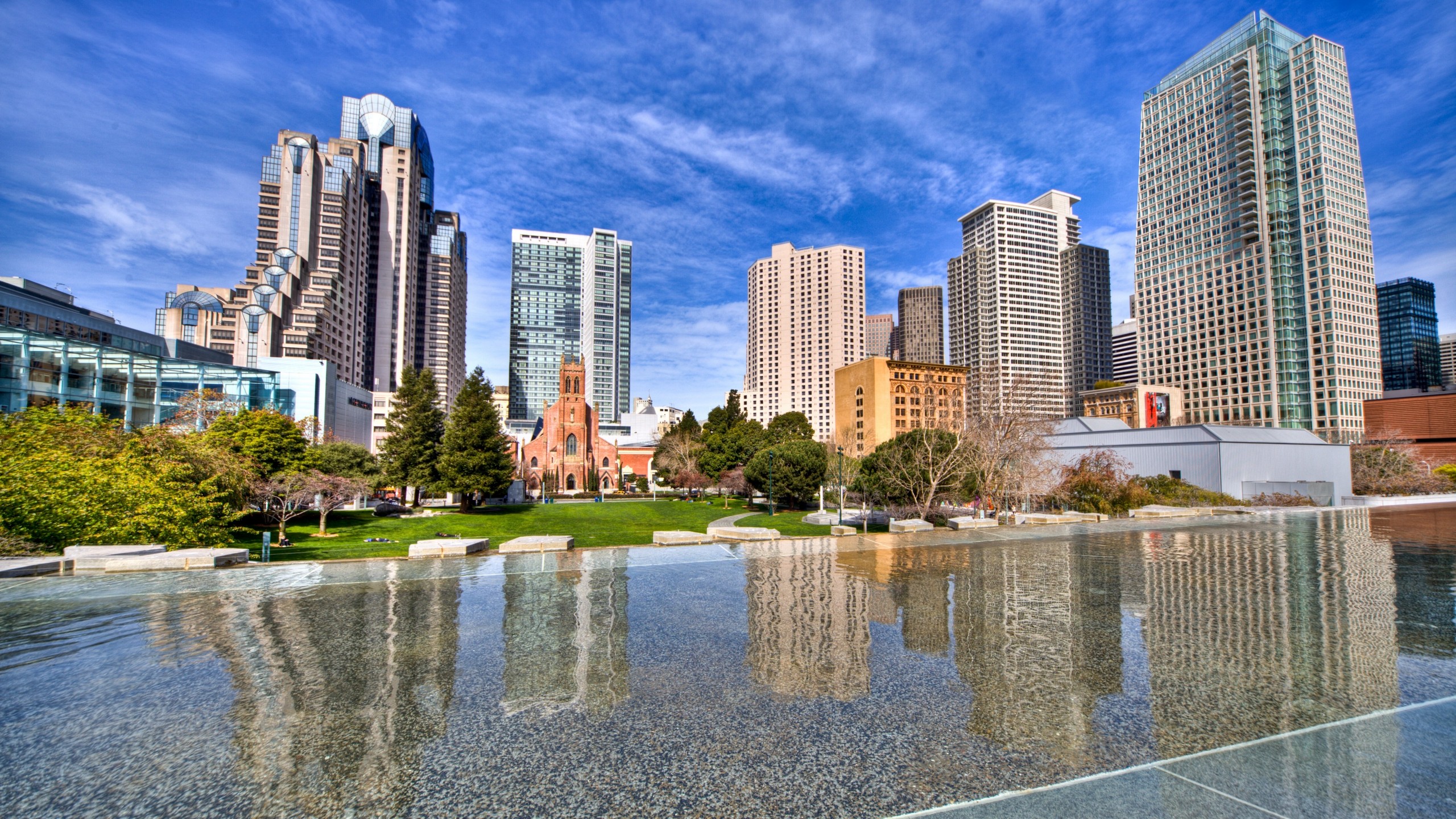 Скачать обои для рабочего стола Горoд с многоэтажными зданиями солнечной погодой и фото