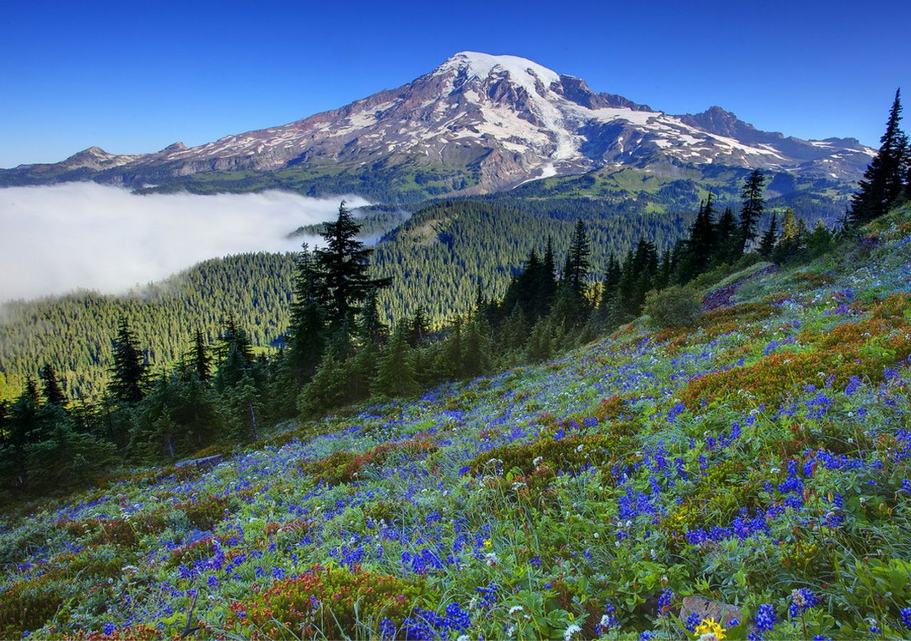 Похожие обои на Горы, цветы, туман и синее небо:
