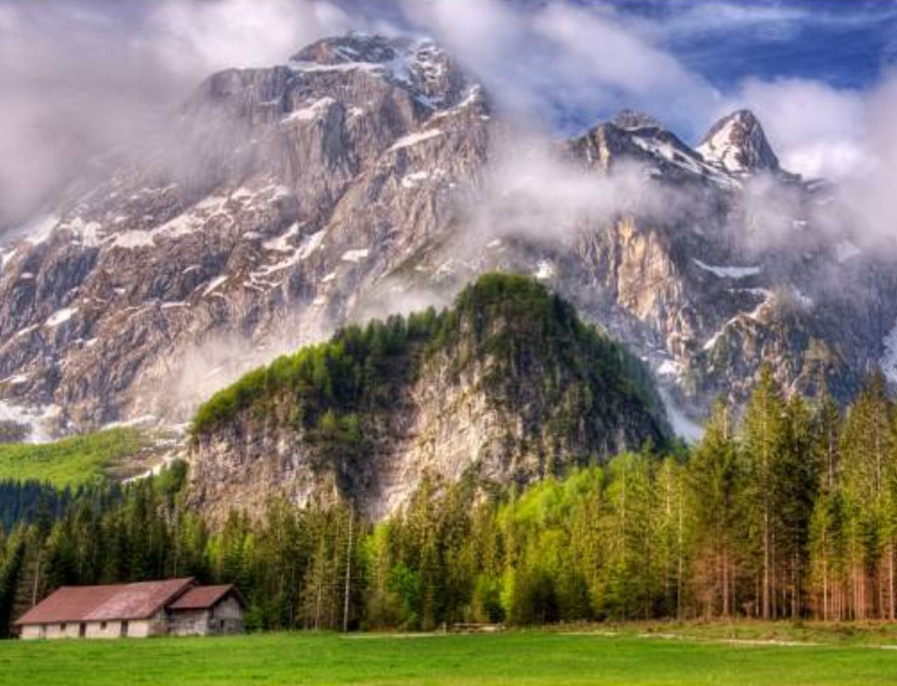 Похожие обои на Горы, домик и утёс: