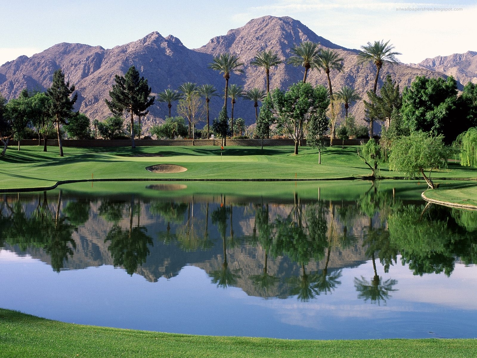 Скачать обои для рабочего стола Горы , поле для гольфа и озеро и фото