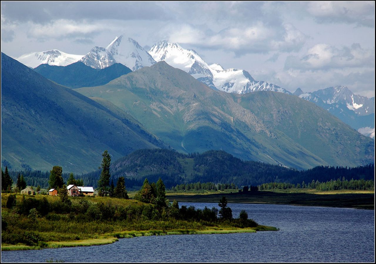 Скачать обои для рабочего стола Горы, река и дома и фото