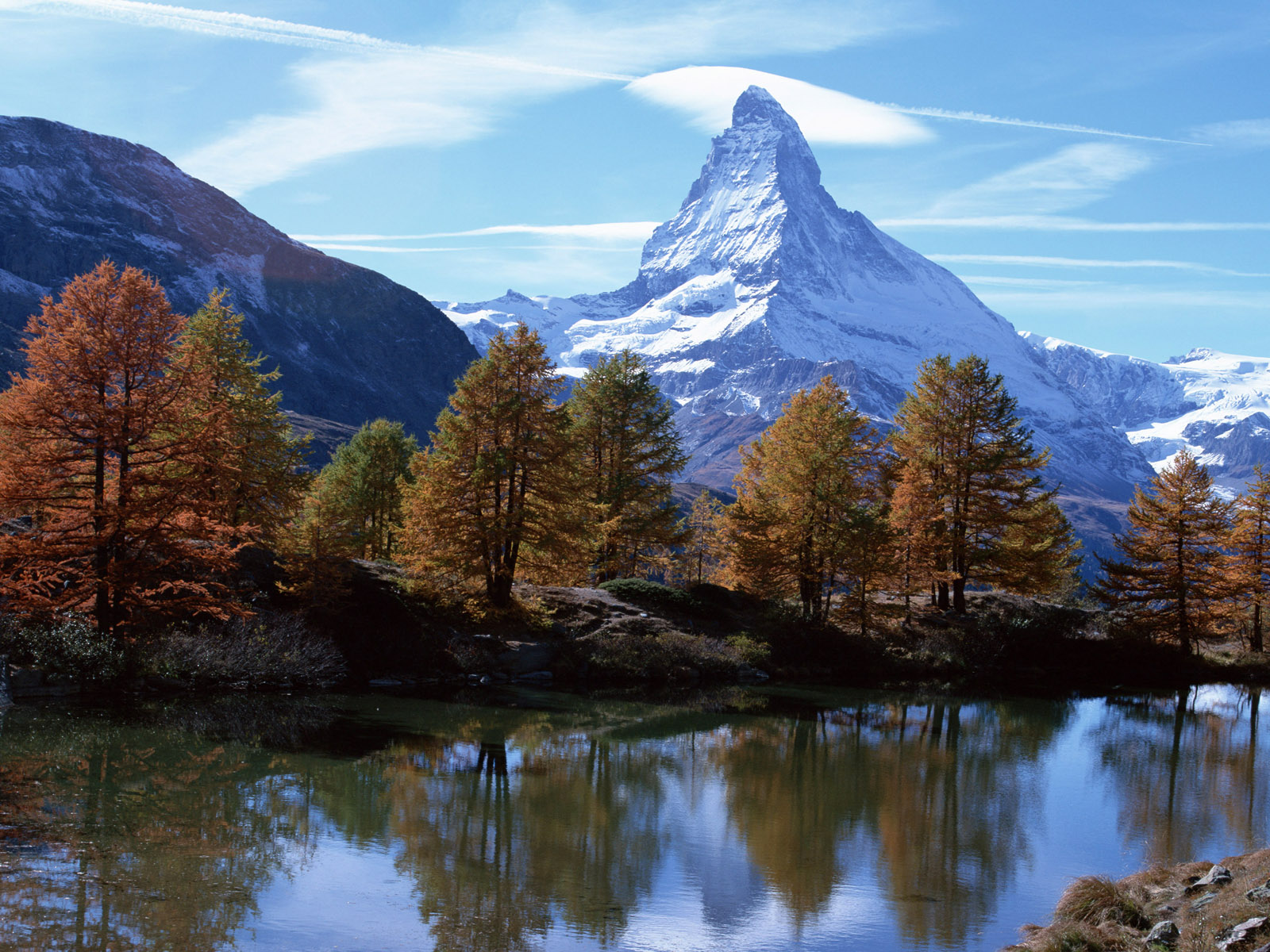 Скачать обои для рабочего стола Горы у пруда, осенние деревья и фото