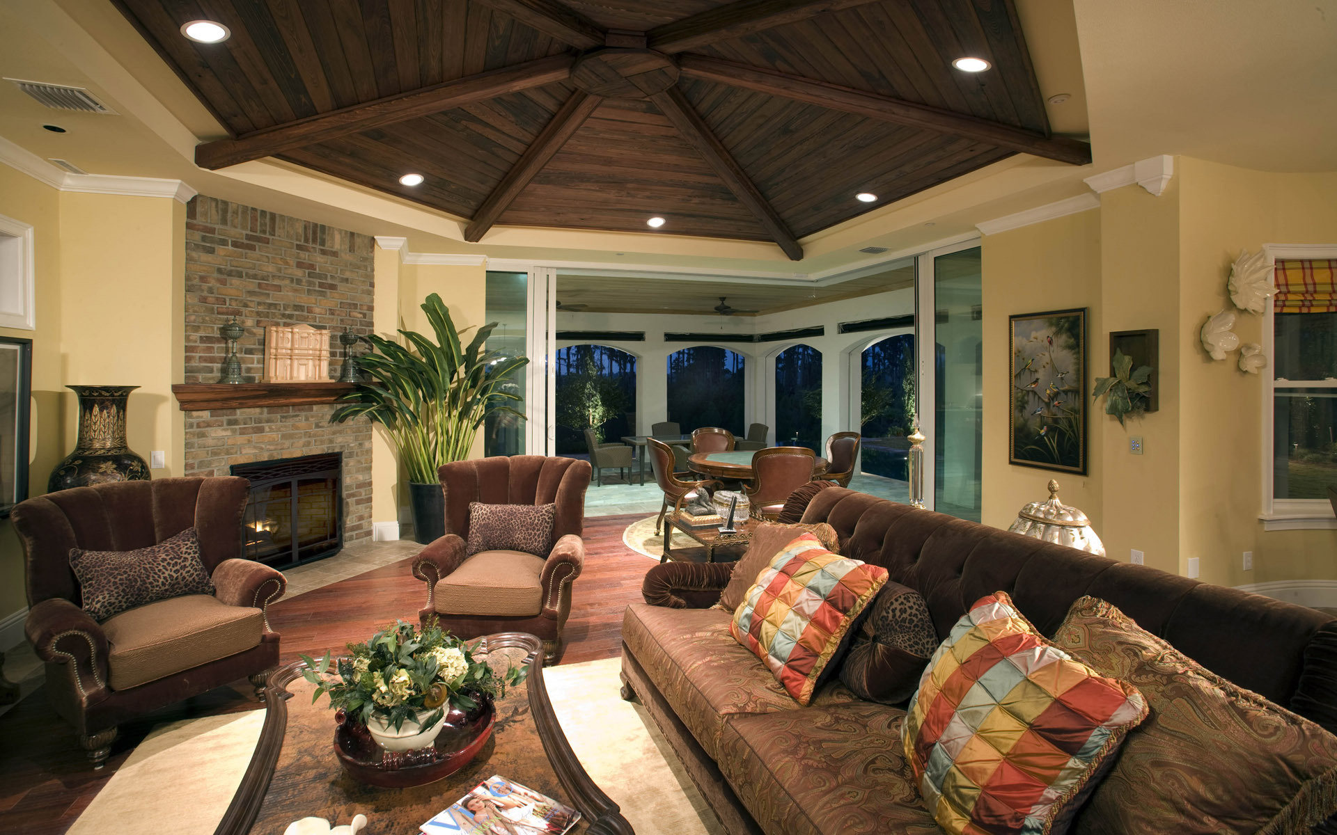 Скачать обои для рабочего стола Гостиная комната с деревянным потолком и фото