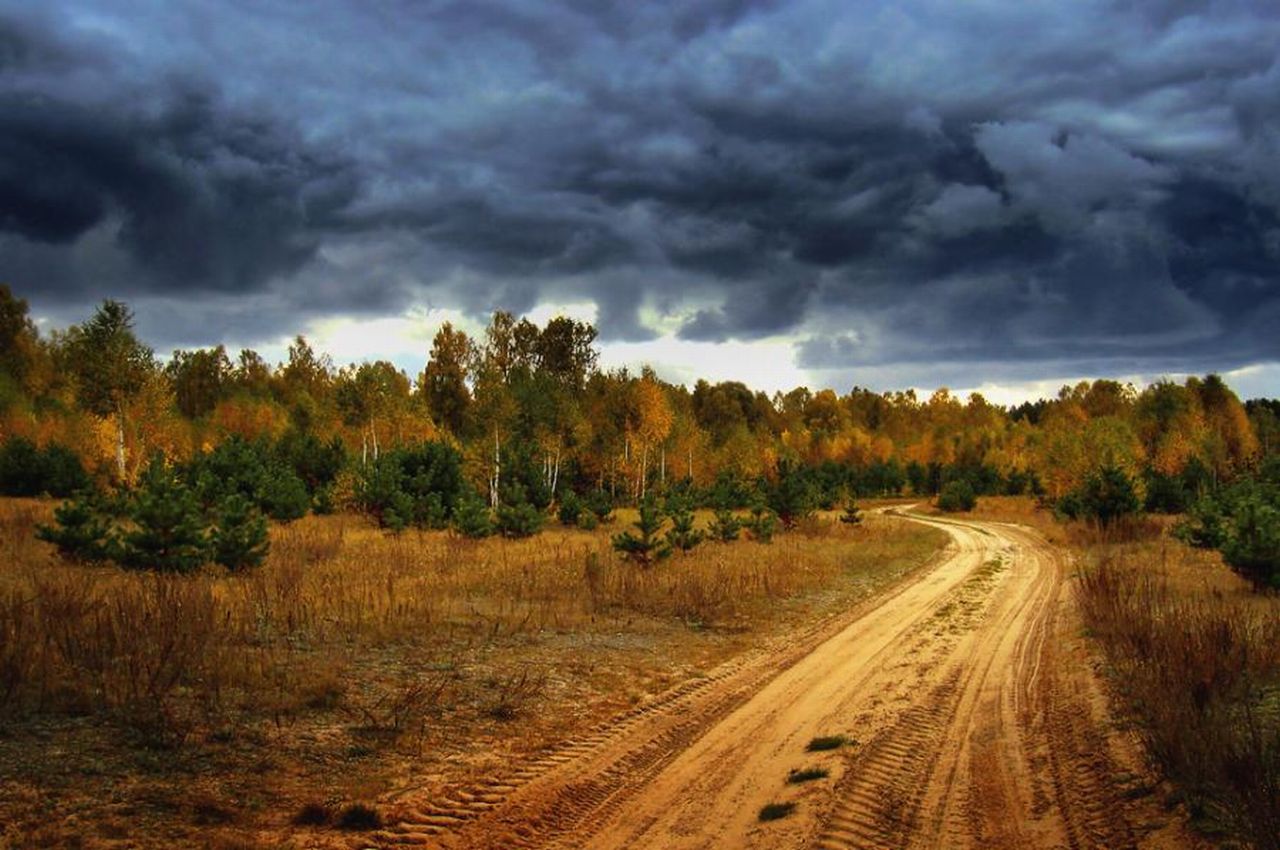 Скачать обои для рабочего стола Грунтовая дорога в осенний лес и фото