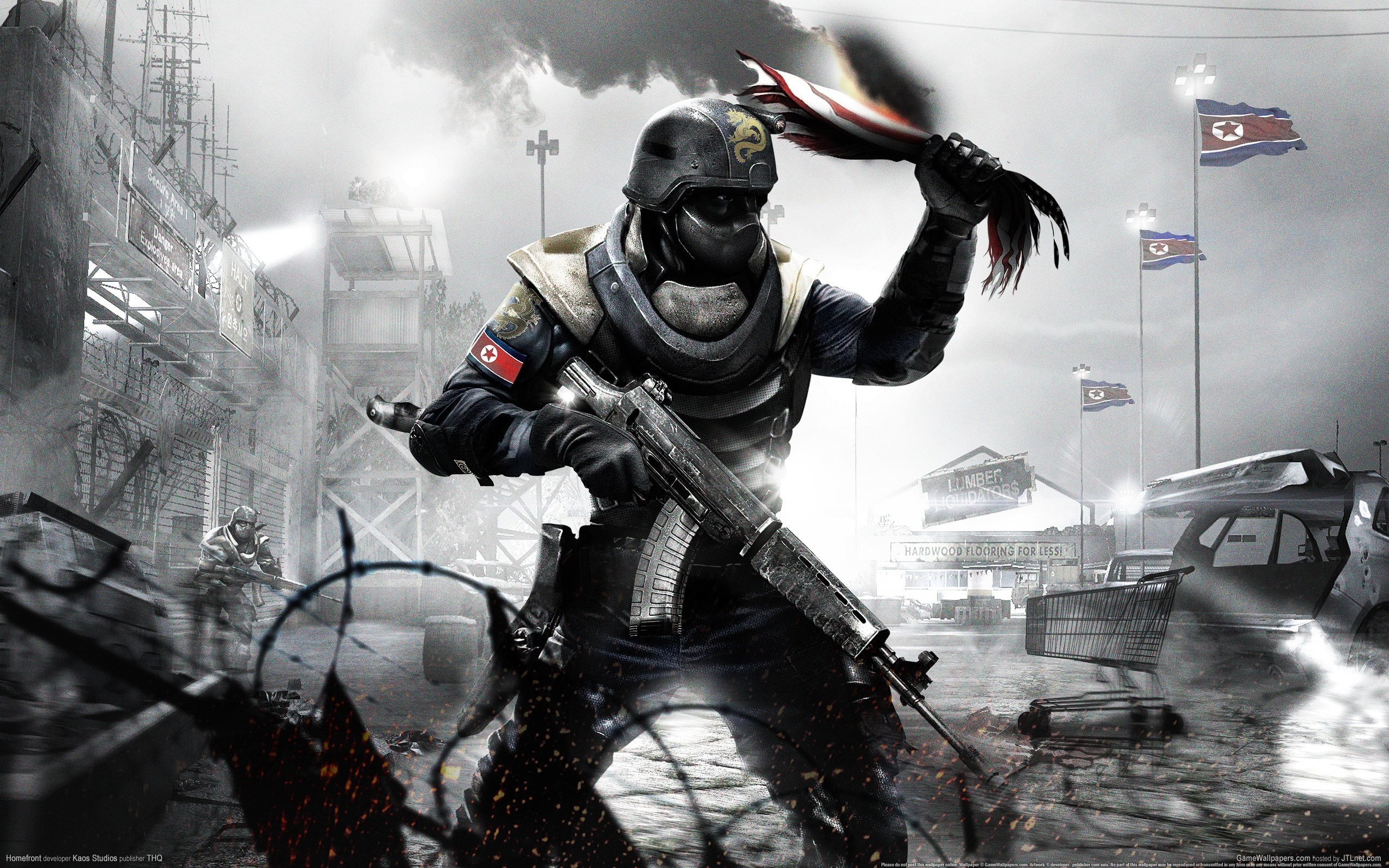 Скачать обои для рабочего стола Homefront, боец востания с обгорелым флагом и фото