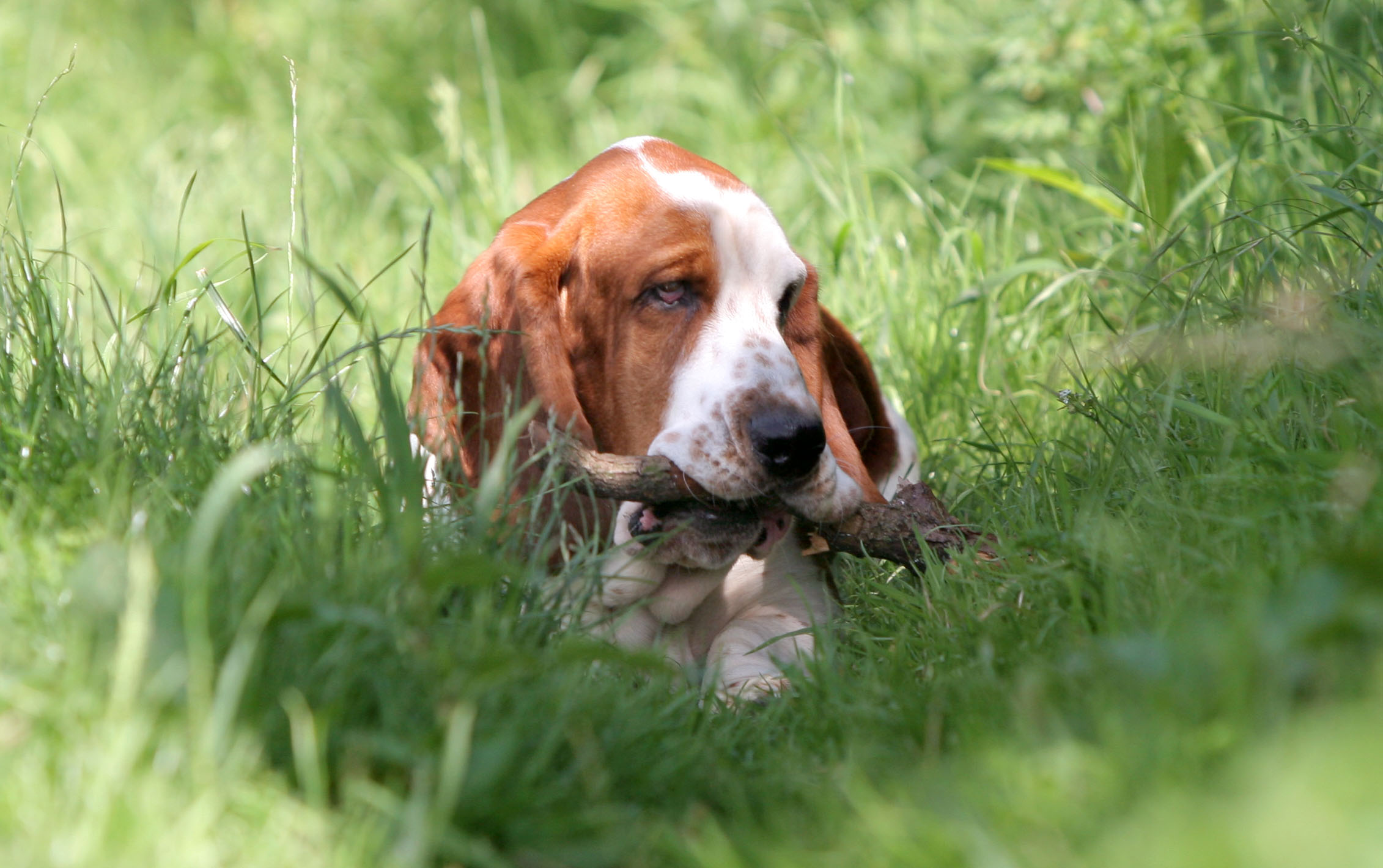 Скачать обои для рабочего стола Играет собака на природе и фото