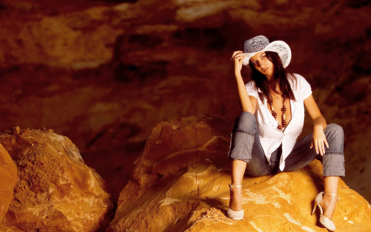 Скачать обои для рабочего стола Jana Defi на камнях в шляпе и фото