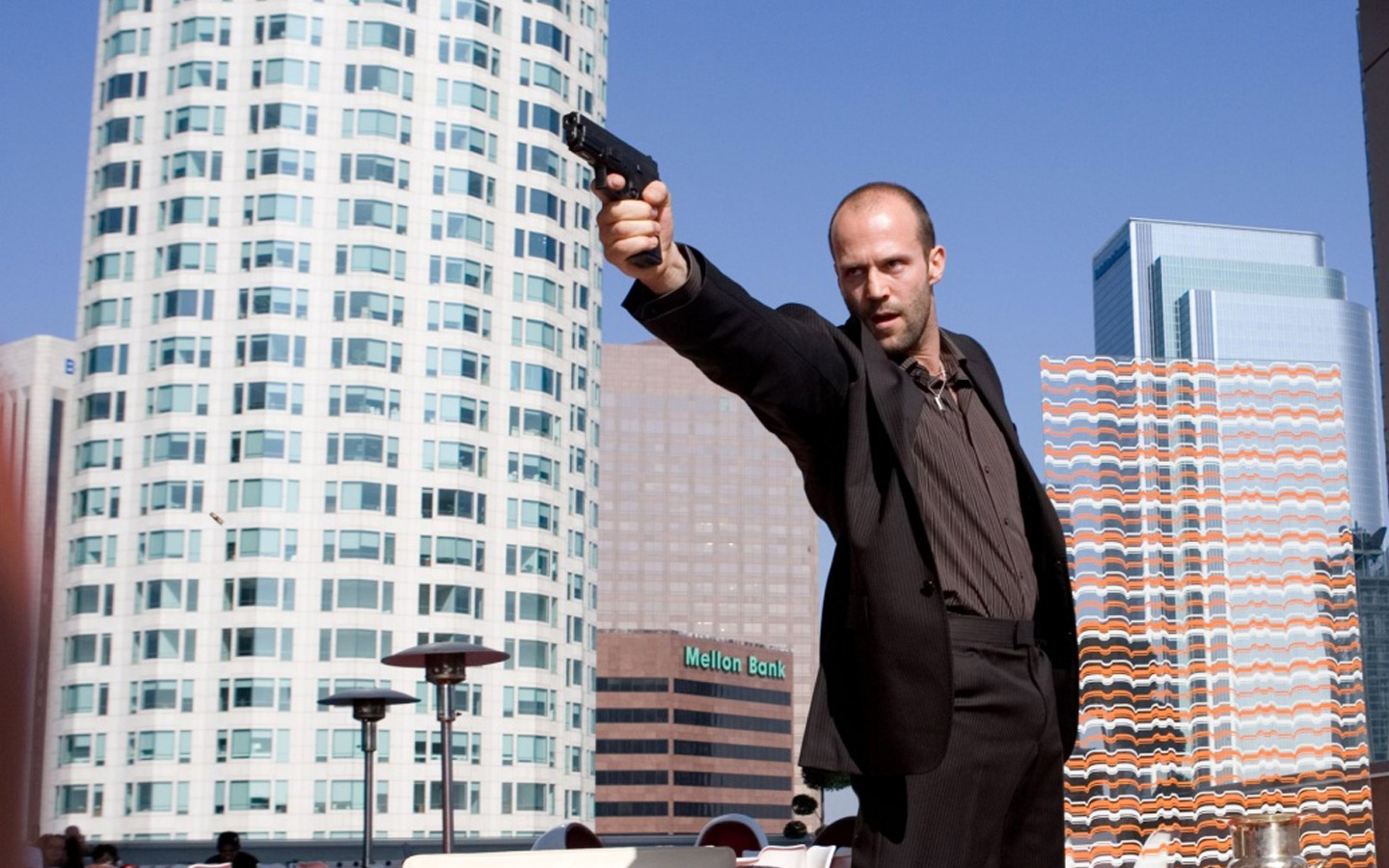 Обои Jason Statham в кафе с пистолетом