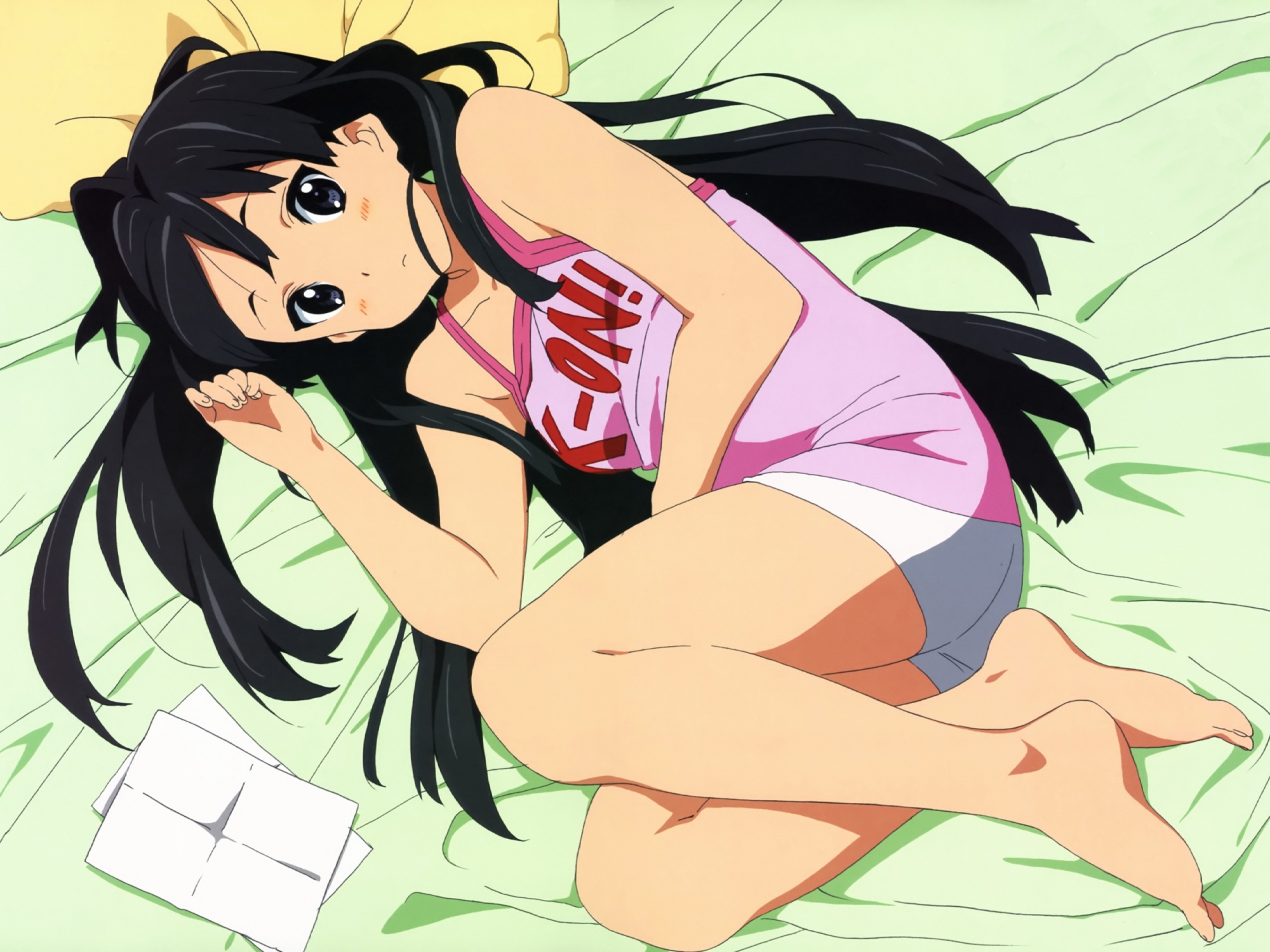 Скачать обои для рабочего стола K-On! - Девушка на зеленой постели и фото