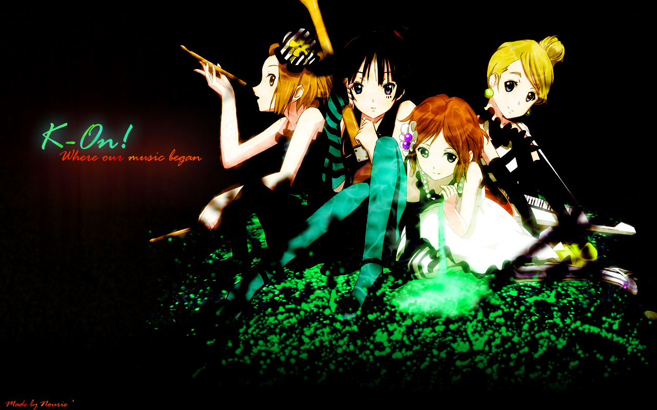Скачать обои для рабочего стола K-On! - Девушки на черно-зеленом фоне и фото