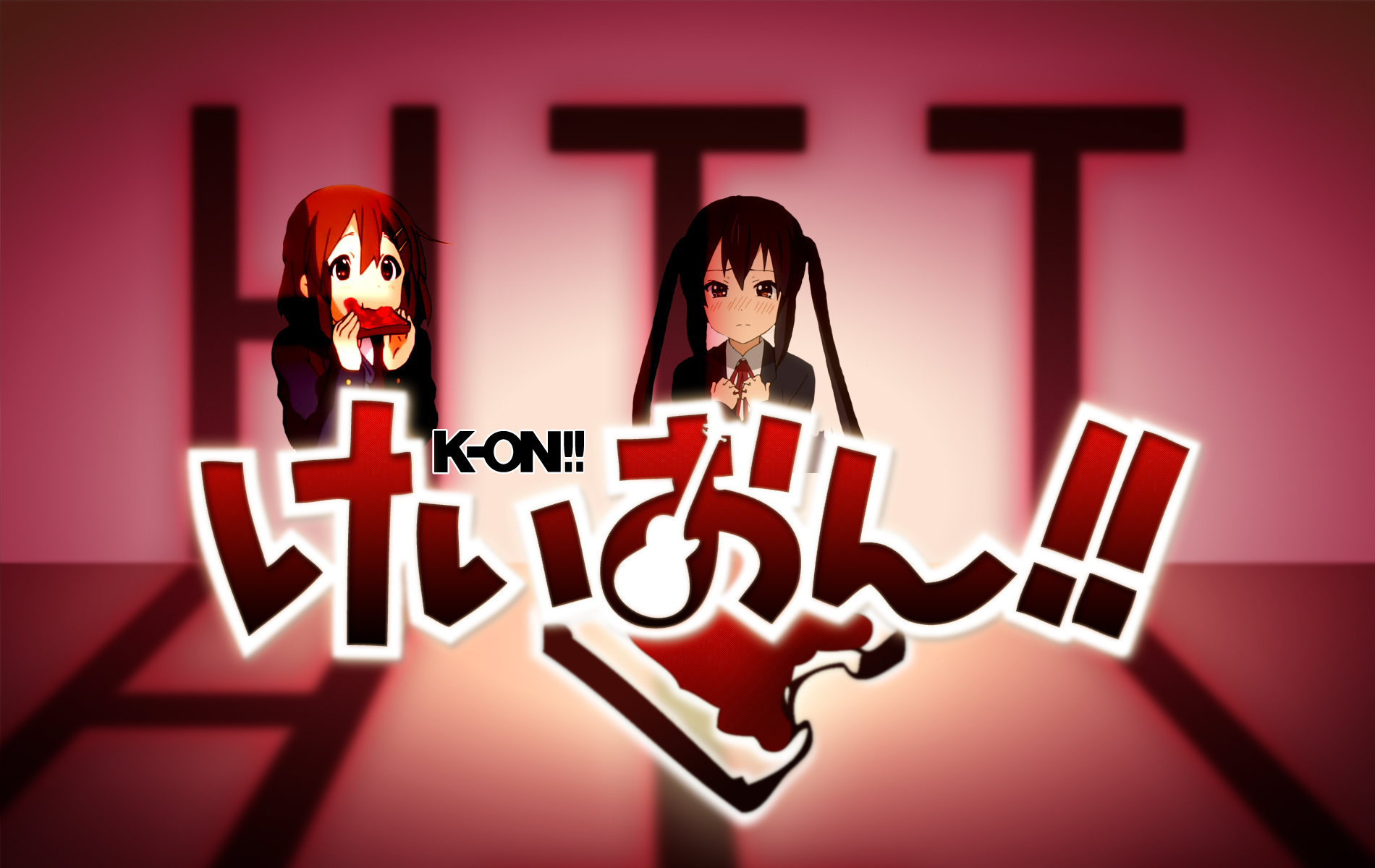 Обои K-On! - Yui и Azusa на фоне надпись HTT