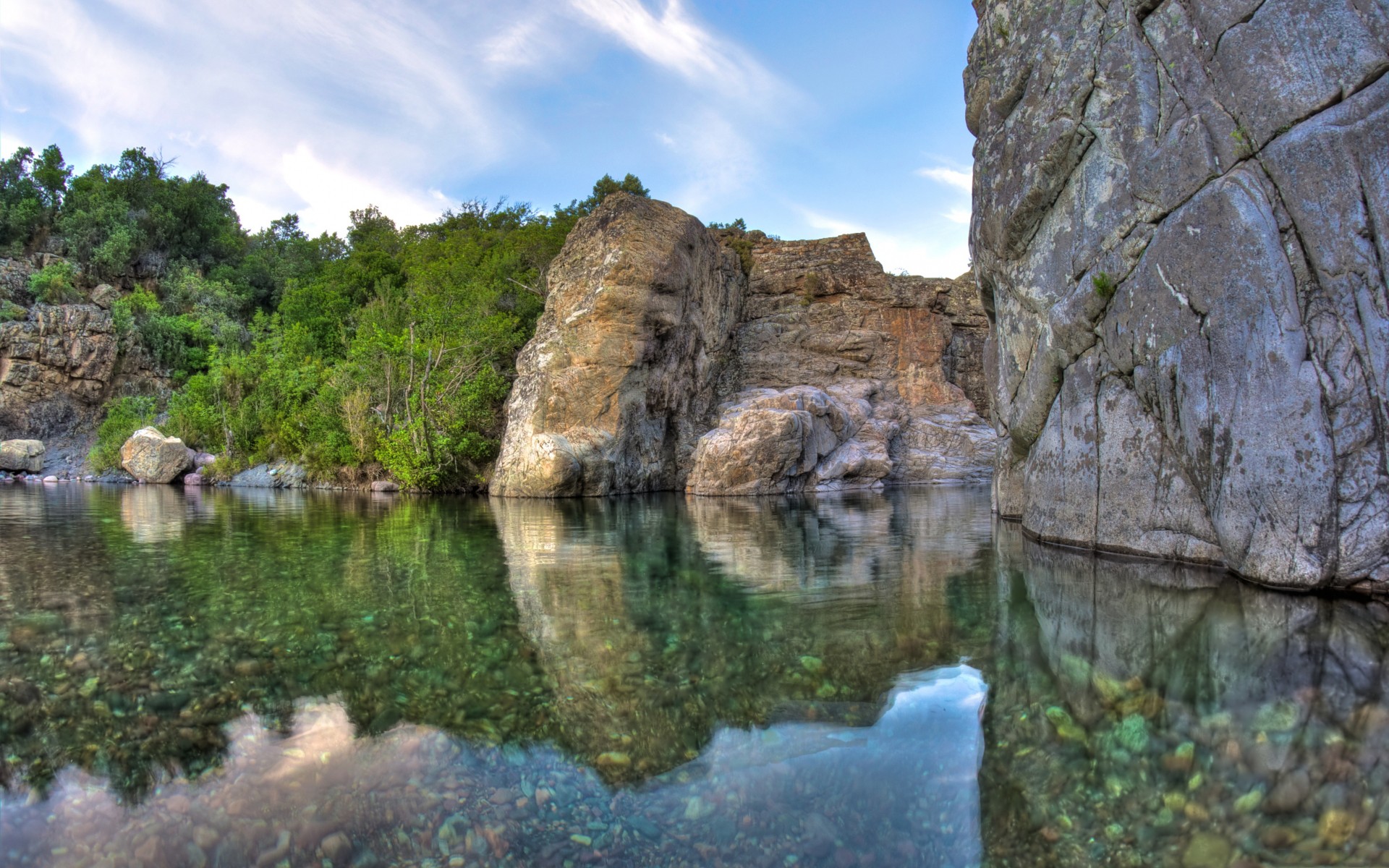 Скачать обои для рабочего стола Каменистый берег прозрачной реки и фото