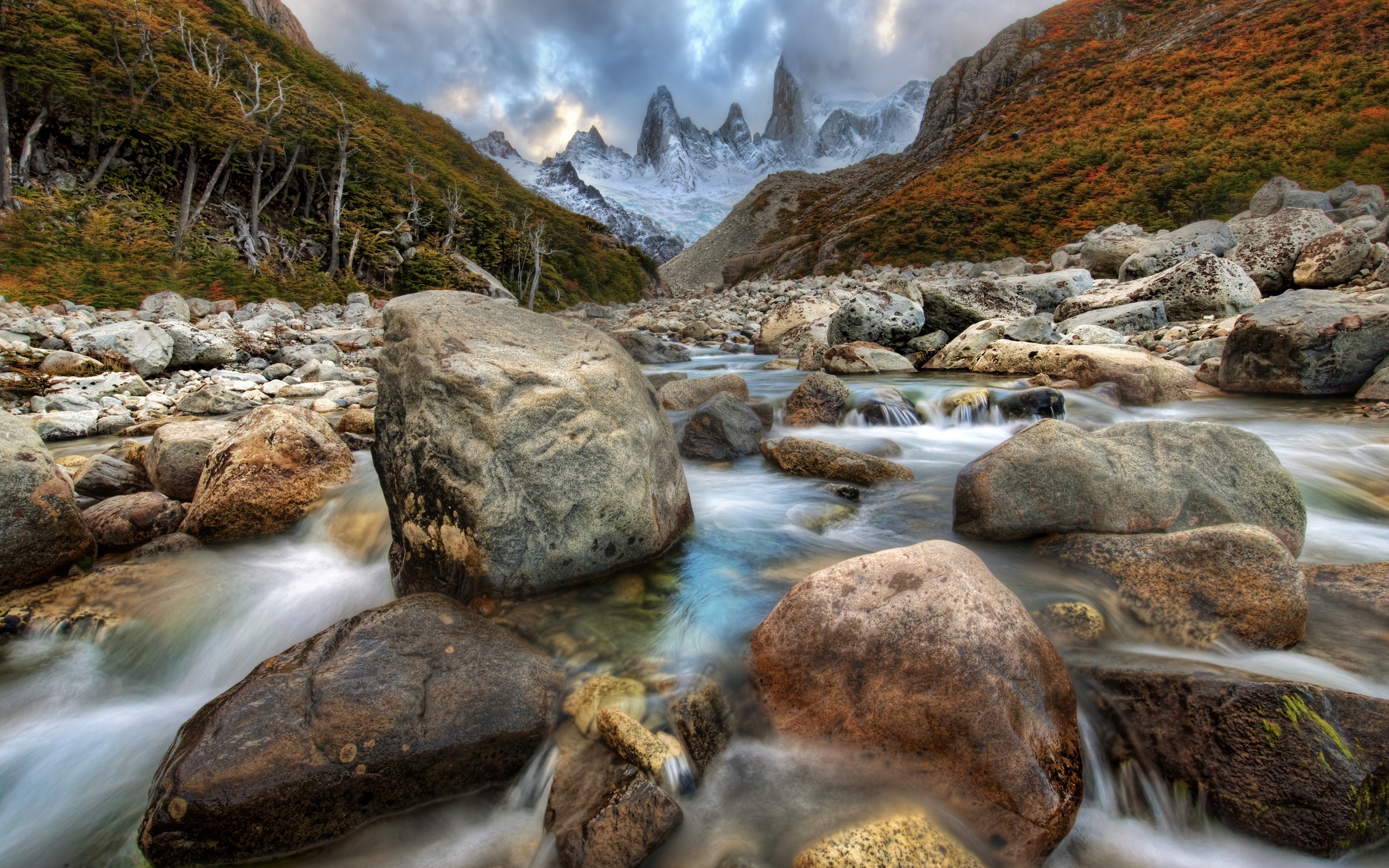 Скачать обои для рабочего стола Каменные глыбы разных цветов в шустрой реке и фото