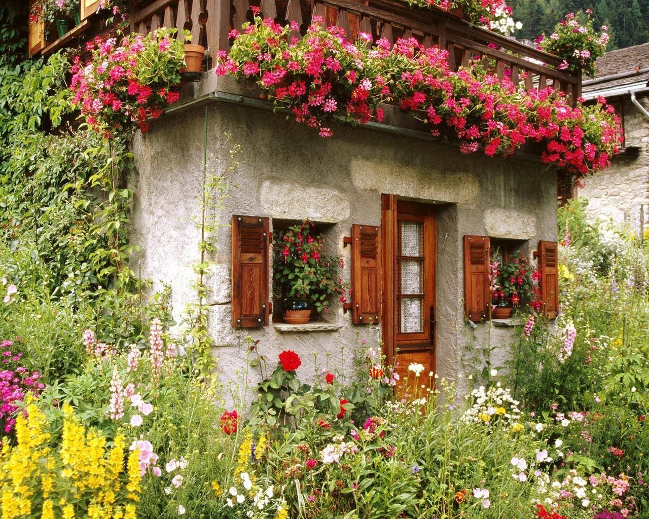 Скачать обои для рабочего стола Каменный уютный домик заросший разноцветными цветами и фото