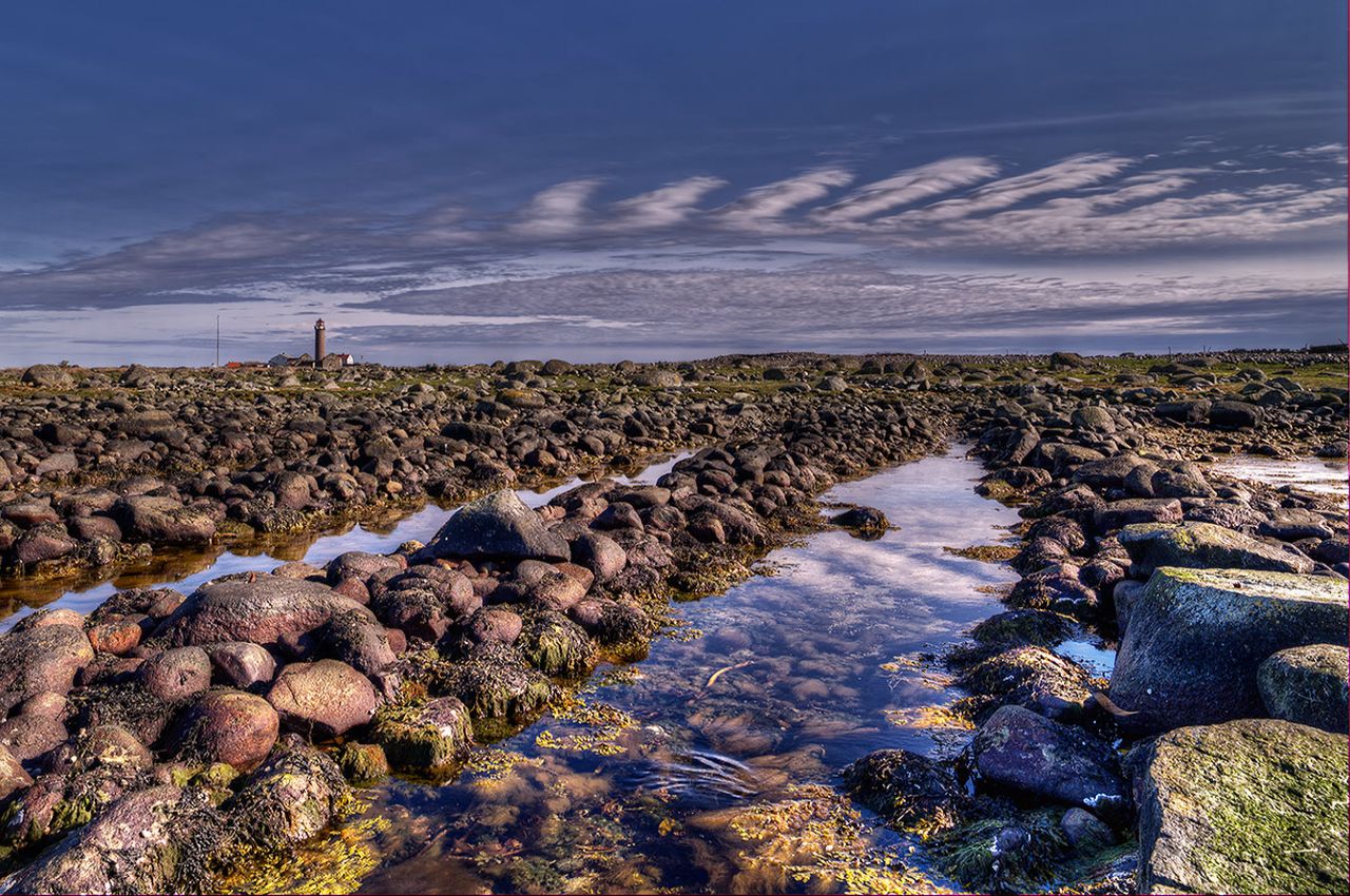 Скачать обои для рабочего стола Камни, небо и маяк и фото