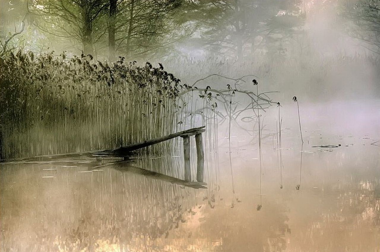 Скачать обои для рабочего стола Камышовая заводь в тумане и фото