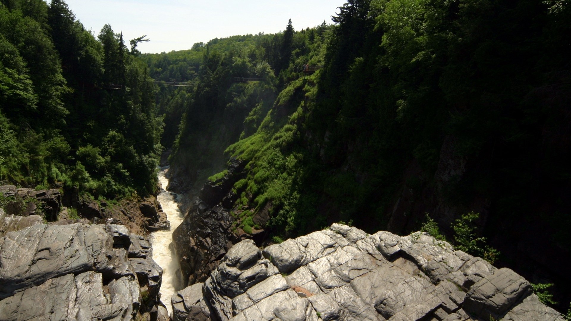 Скачать обои для рабочего стола Канатная дорога через пропасть с быстрой рекой и фото