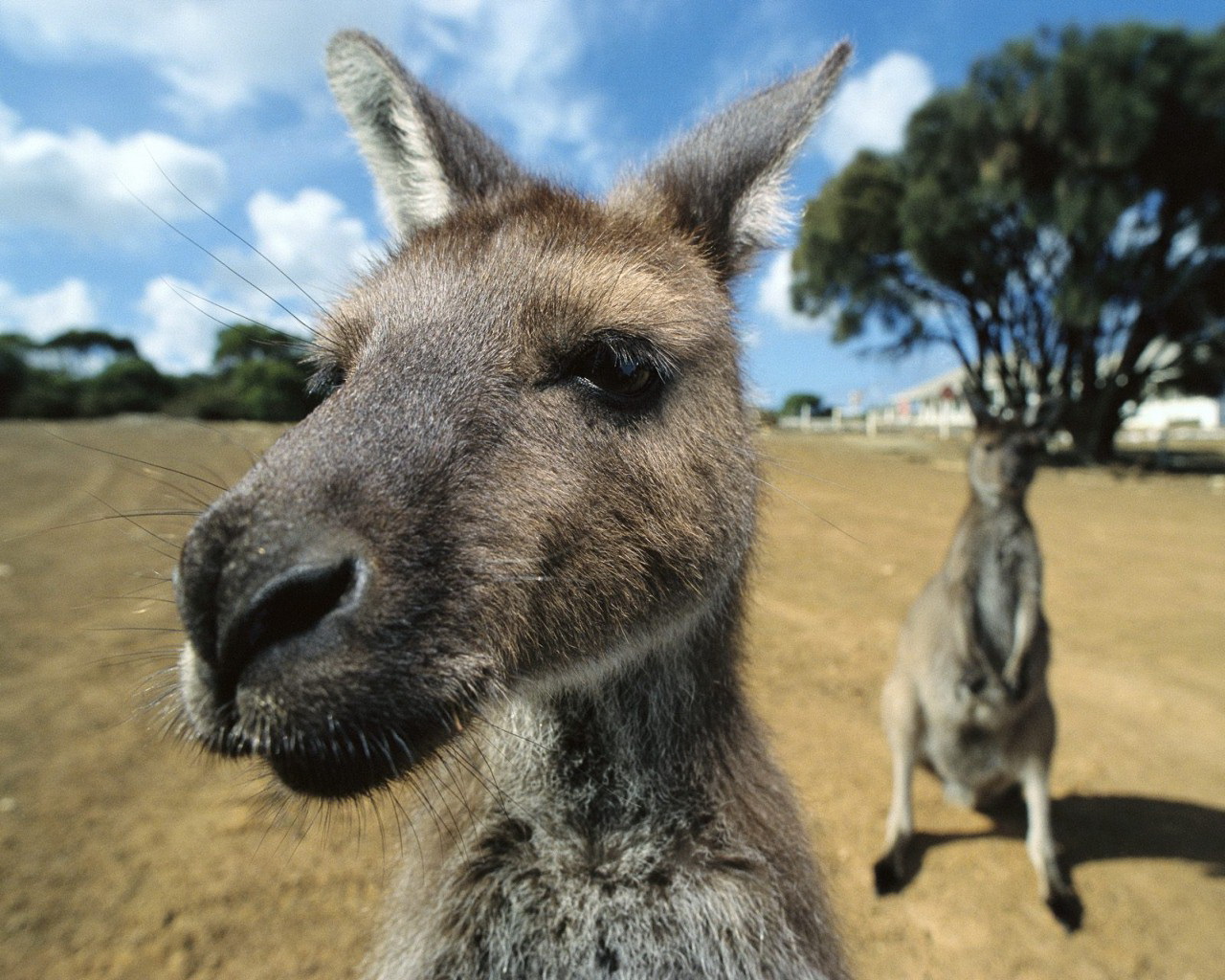 Скачать обои для рабочего стола Кенгуру смотрит в объектив и фото