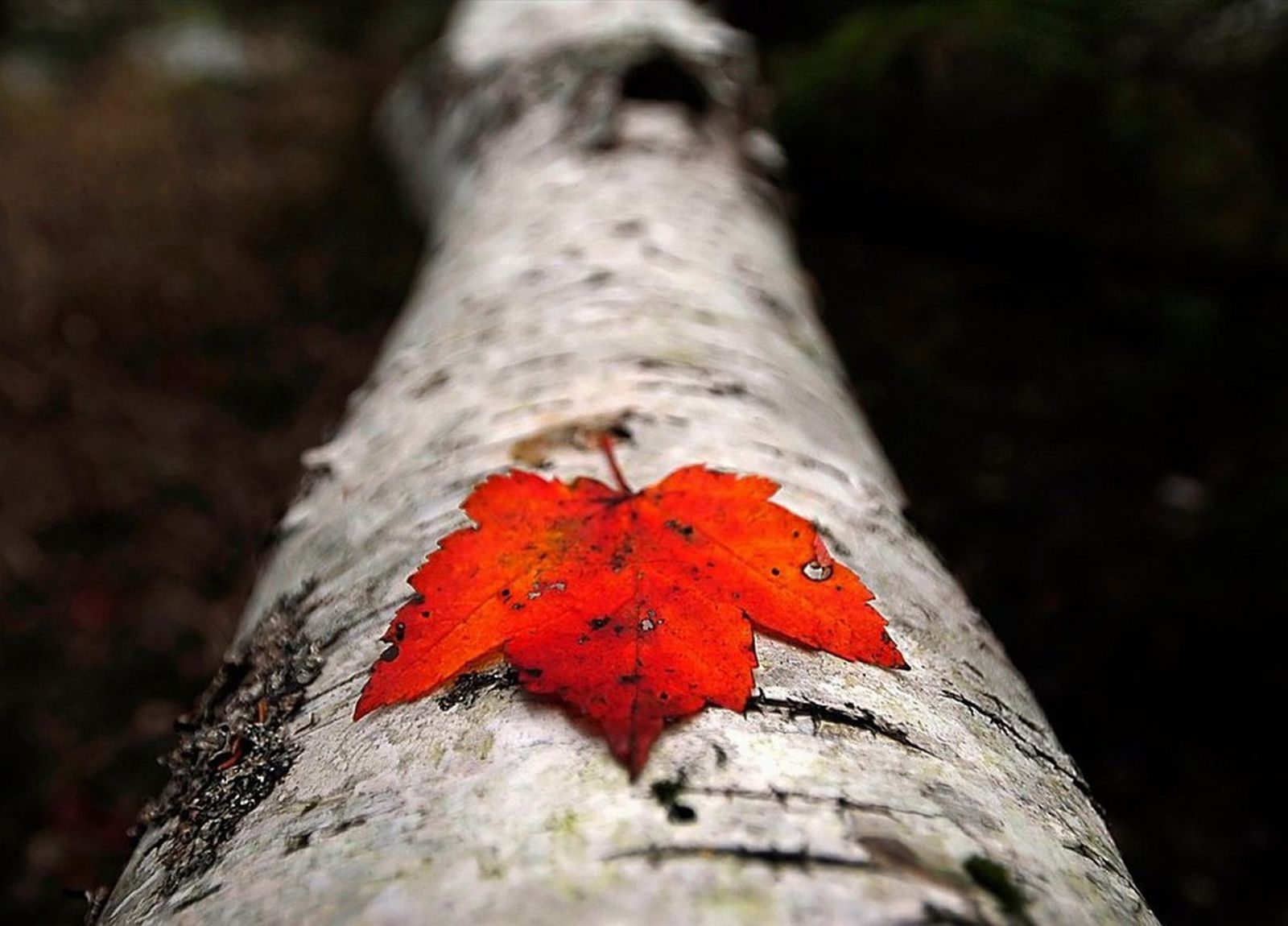 Скачать обои для рабочего стола Кленовый лист на стволе берёзы и фото