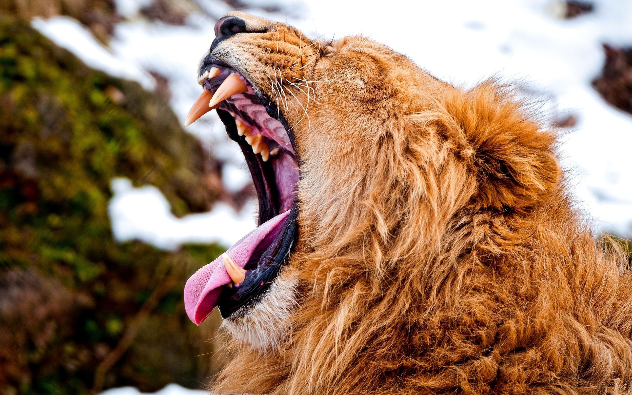 Скачать обои для рабочего стола Клыки и зевающая пасть льва и фото
