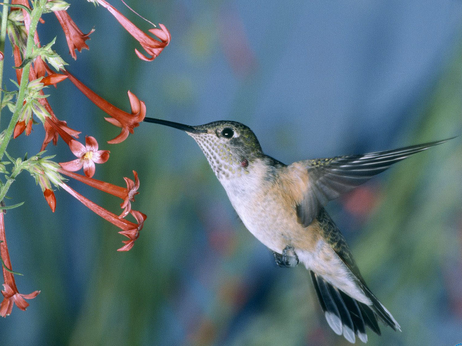 Скачать обои для рабочего стола Колибри подлетела к цвету собрать нектар и фото