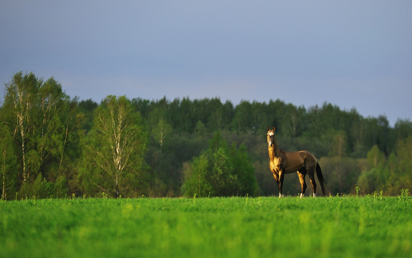 Скачать обои для рабочего стола Конь на зеленых просторах и фото
