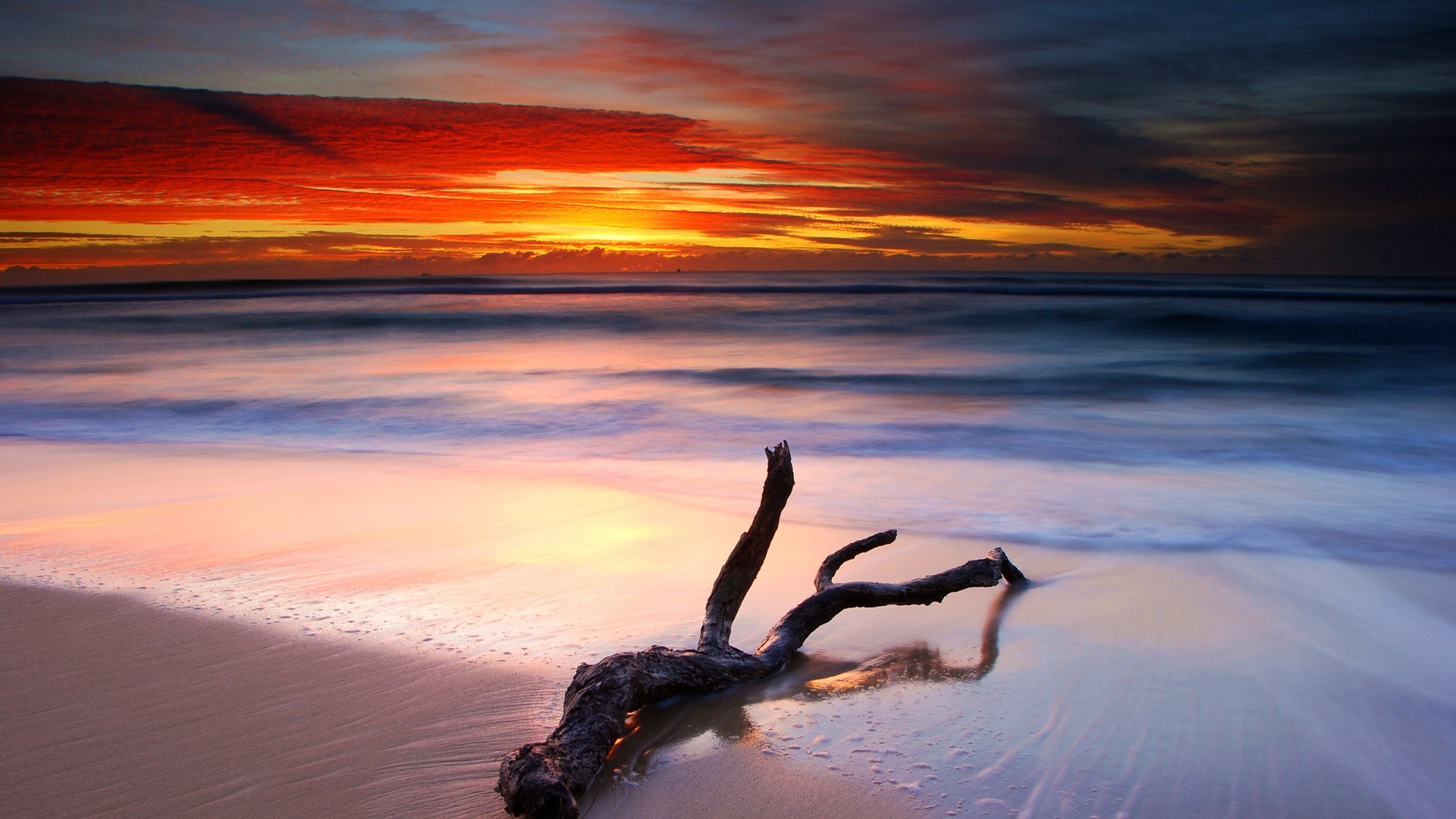 Скачать обои для рабочего стола Коряга на мокром песчaнoм берегу и фото