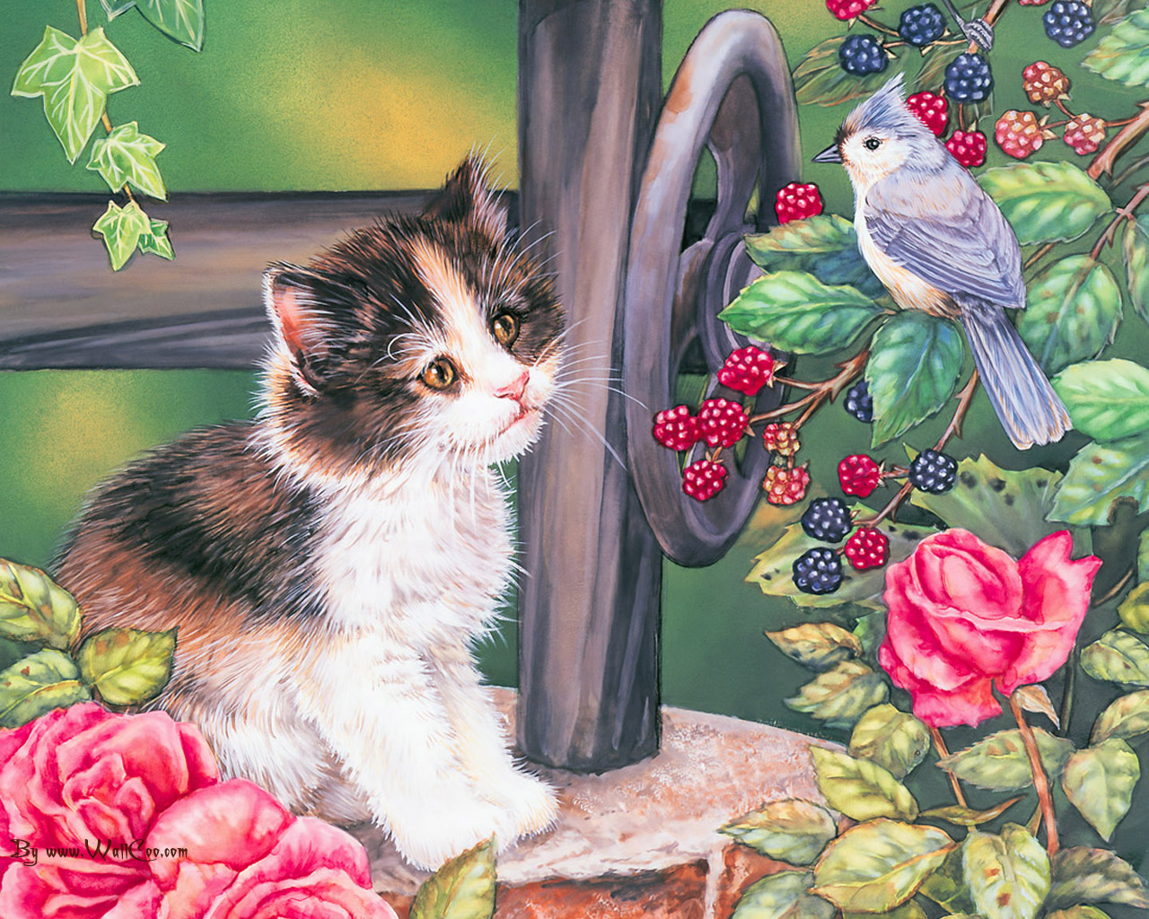 Скачать обои для рабочего стола Кошка и птичка и фото