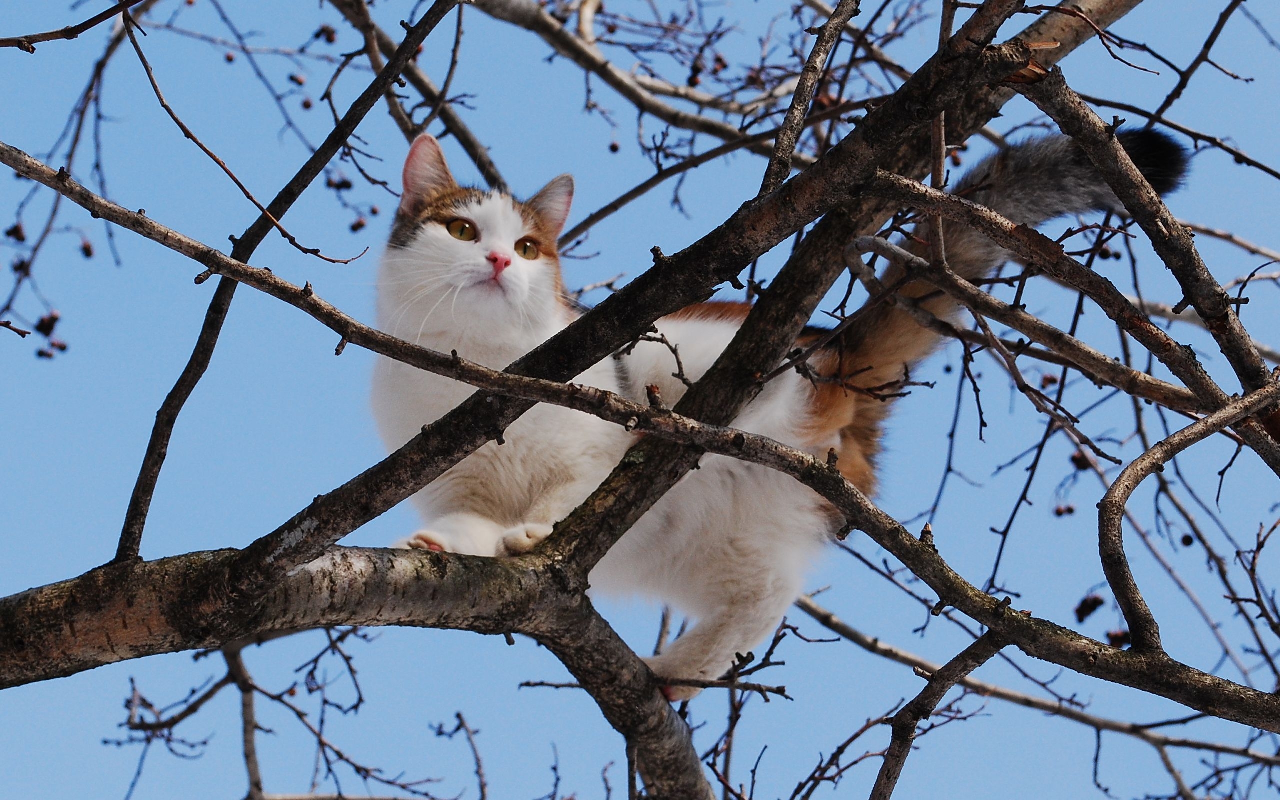Скачать обои для рабочего стола Кошка на дереве и фото