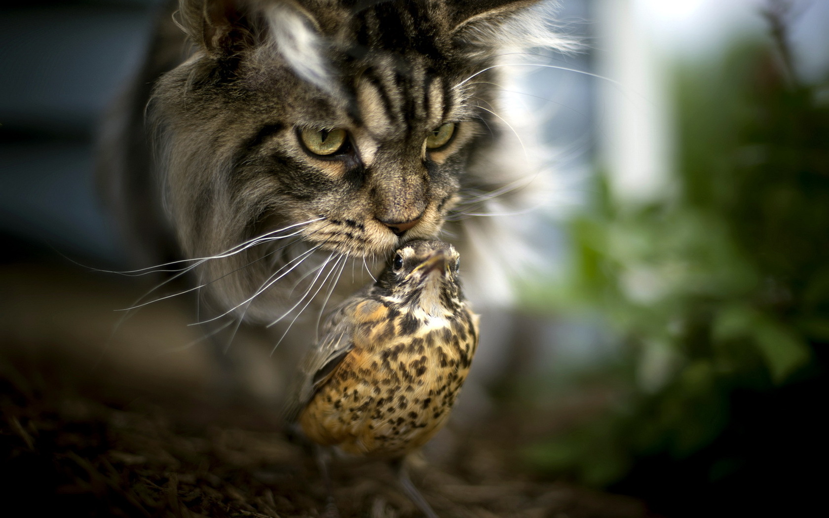 Скачать обои для рабочего стола Кошка следит за птичкой и фото