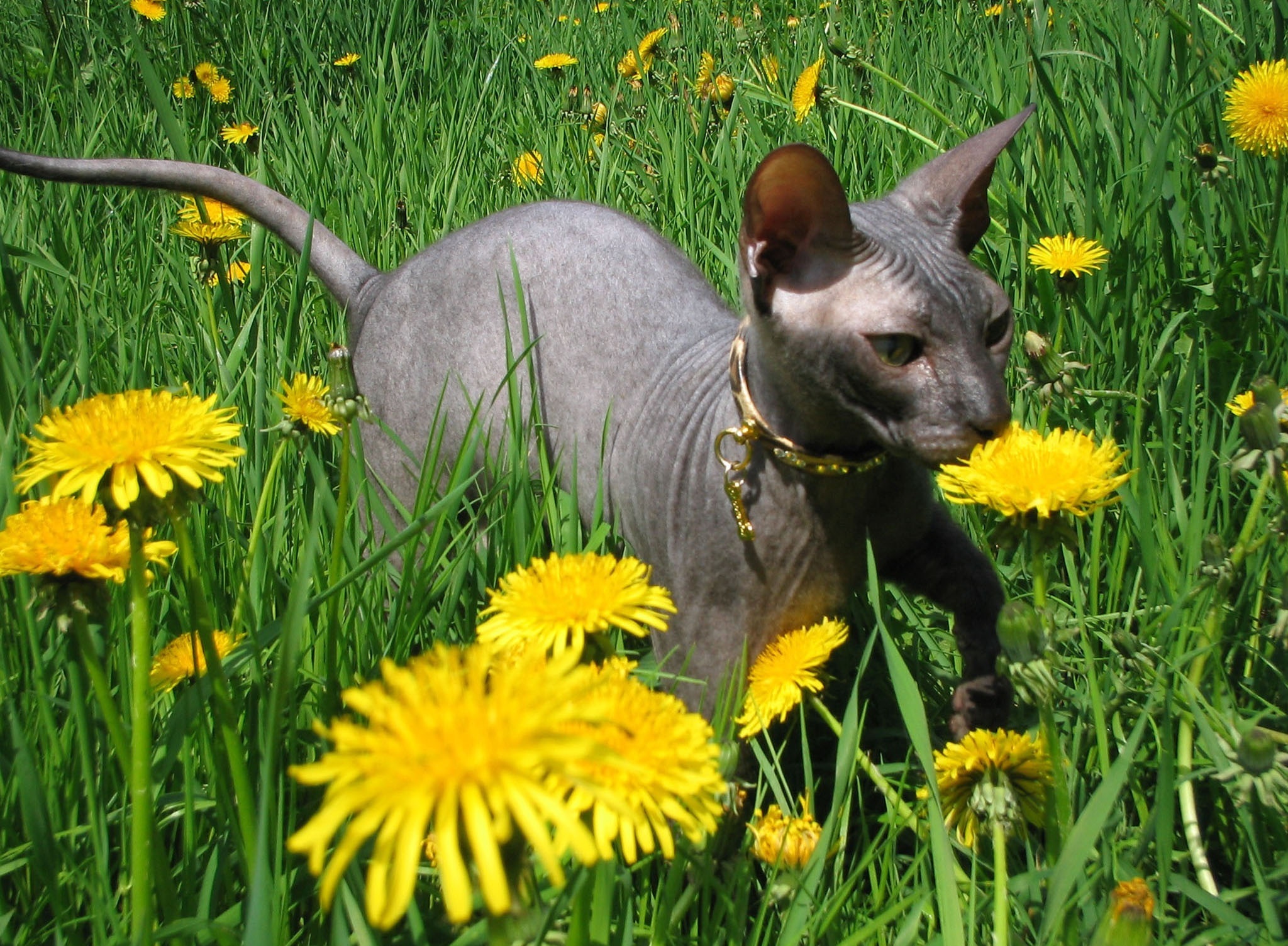 Скачать обои для рабочего стола Кошка в одуванчиках и фото
