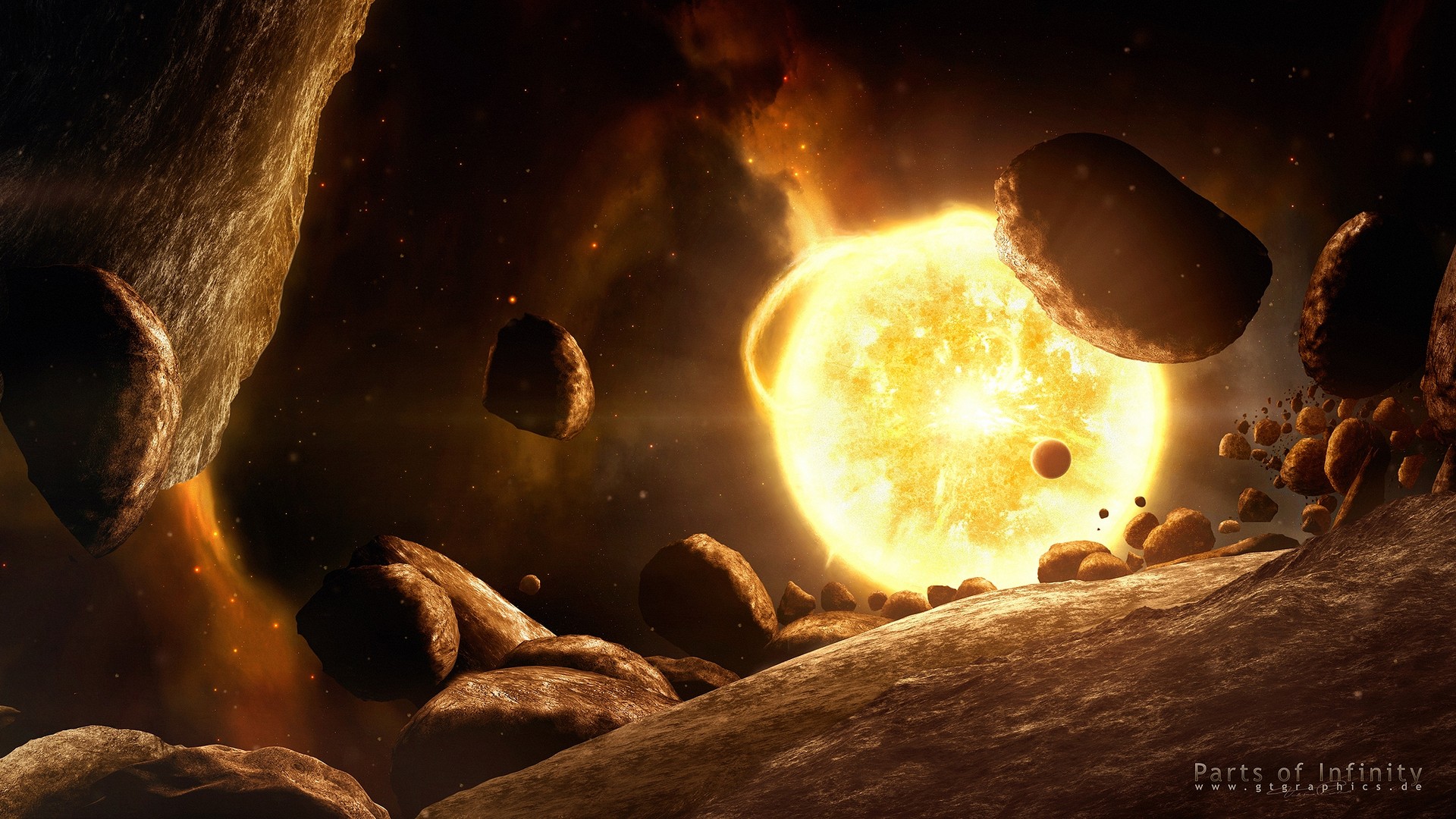 Скачать обои для рабочего стола Космические астероиды возле раскаленной планеты и фото